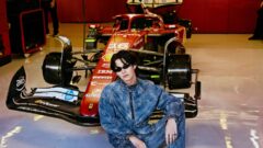 マーククリスが着用しているのは、グリーンの恐竜“レクシー”が印象的なTシャツと、ゆったりとしたカーゴパンツ、そして白のスーベニアジャケット。
