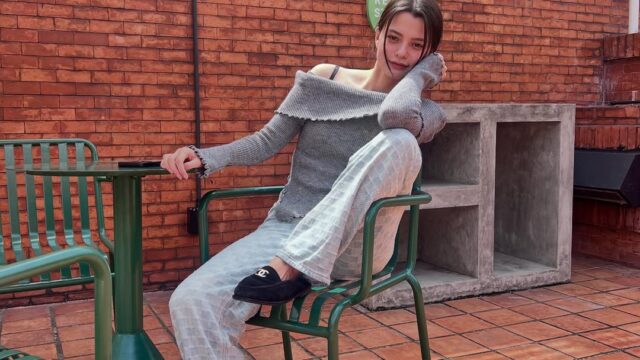 Joongはこの印象的な空間で、黒い帽子とデニム姿で静かに佇み、芸術を楽しむひとときを切り取っています。