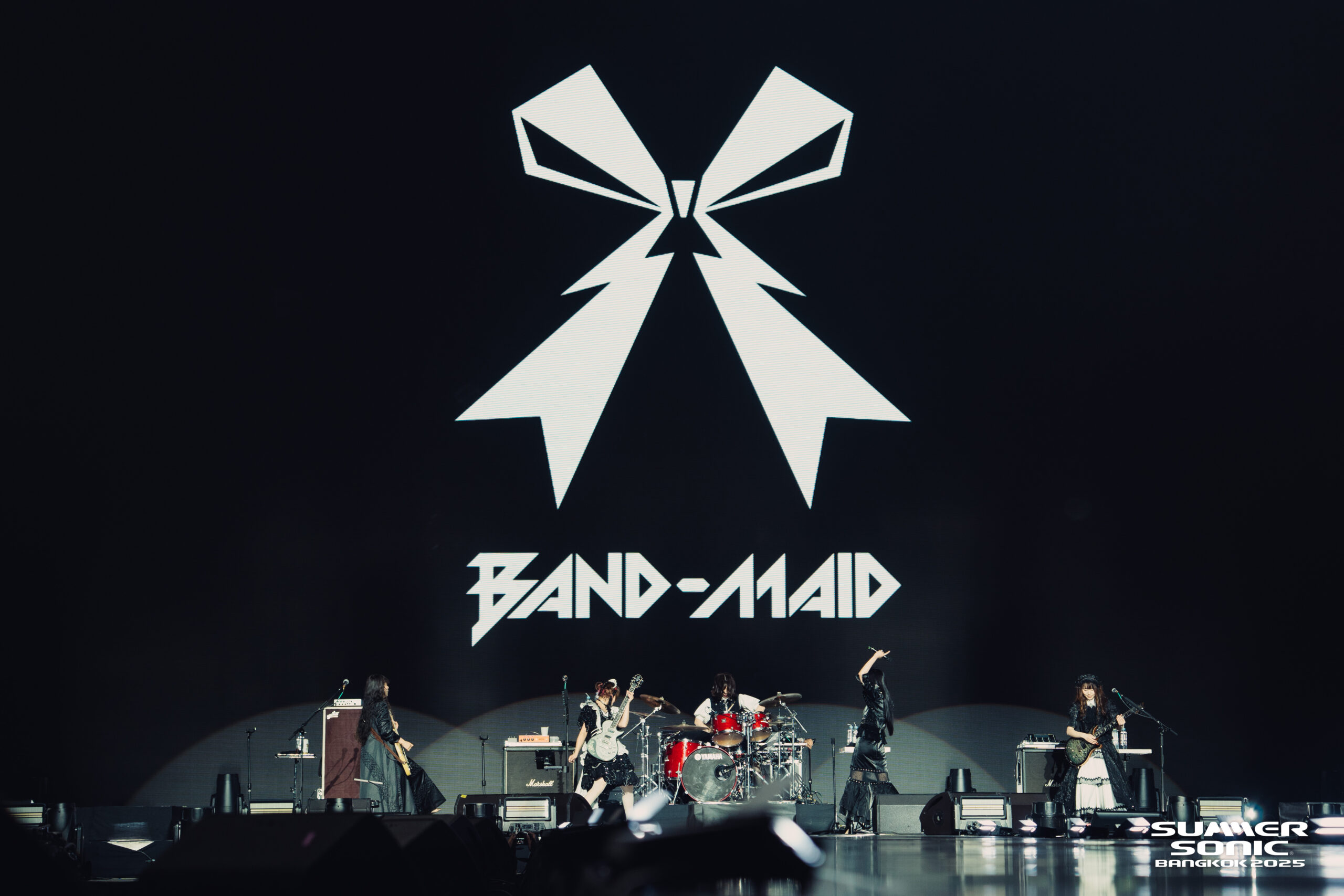 そしてメイド服姿で登場したBAND-MAIDから放たれるのは、鋭く突き刺さるようなギターとドラムが織りなす本格的なハードロック。キュートな外見とハードなサウンドのギャップが観客を驚かせ、やがてその圧倒的な声と演奏力で完全に現地のファンをも魅了していった。花道も駆使したギターやベースソロのたびに歓声が湧き上がり、ドラミングと鼓動を合わすかのように観客の熱狂をさらに盛り上げていったのが印象的だった。
