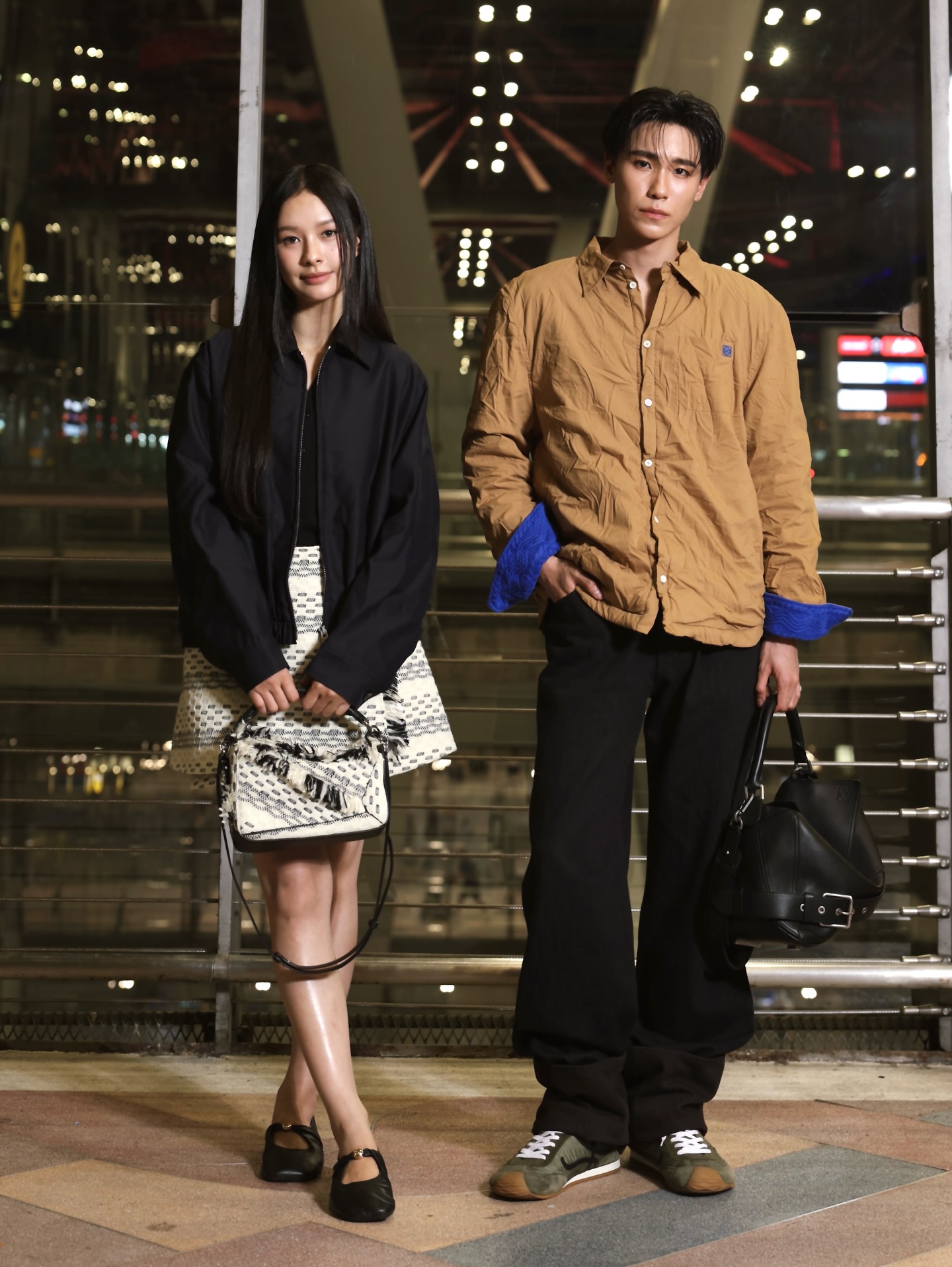 カジュアルながらも洗練された雰囲気を漂わせています。一方、ミルクはモノトーンのスカートとジャケットスタイルに、同じくLOEWEのバッグを合わせ、女性らしい上品さとクールさを両立。ふたりのバランスの取れたスタイリングに、空港は一気にファッションショーのランウェイのような雰囲気に包まれました。