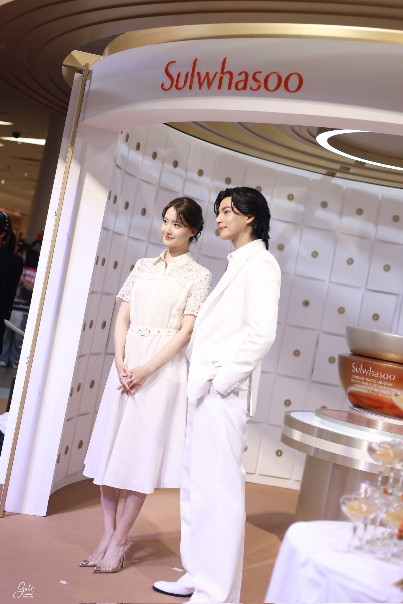白を基調とした洗練された衣装で登場したガルフはブランドの「Friend of Sulwhasoo」として、エレガントな雰囲気のブースで撮影に臨みました。ガルフは白いスーツ、ユナはレースディテールが美しい白いドレスで、ブランドの上品なイメージを完璧に体現していました。