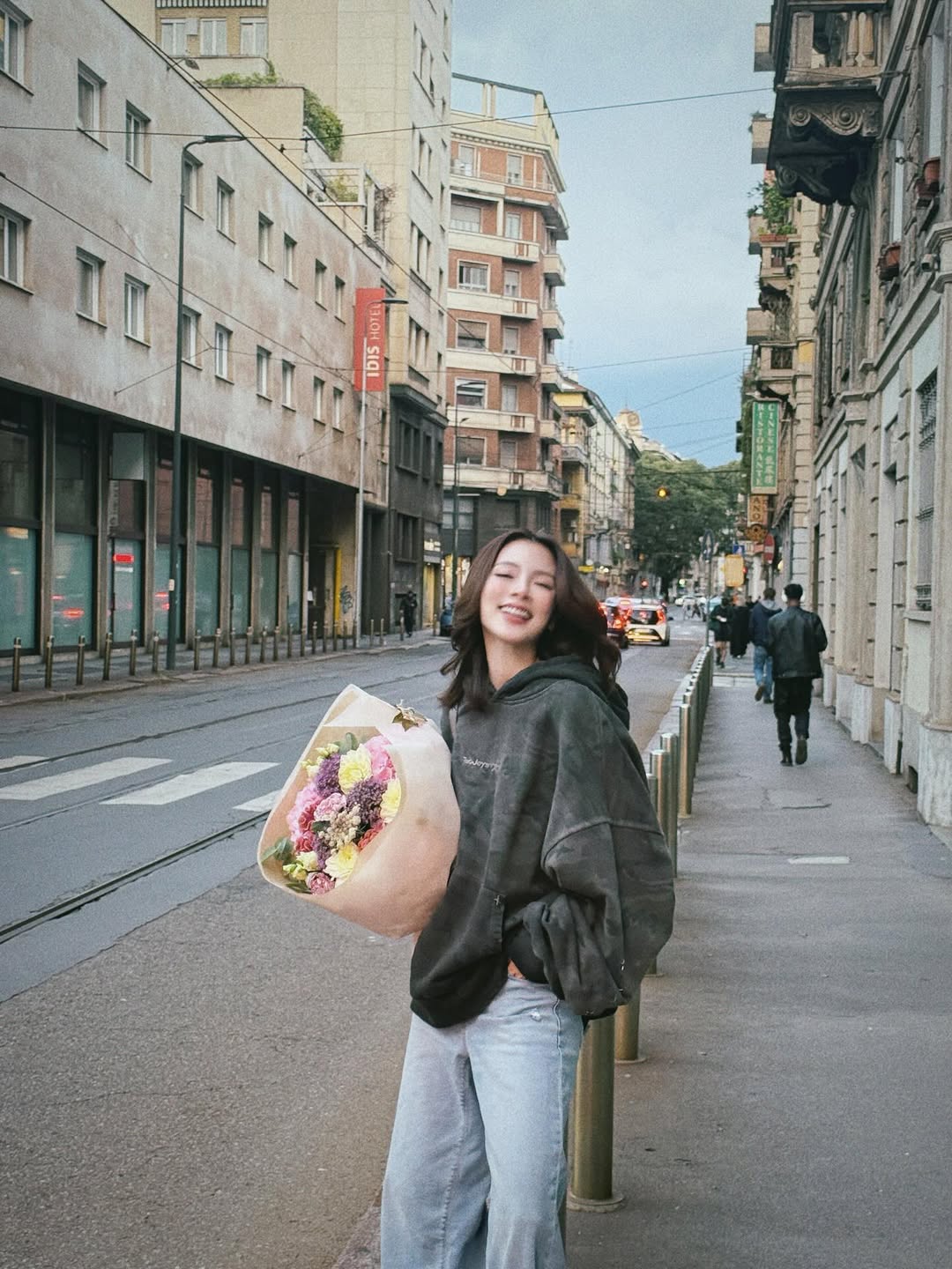 グレーのオーバーサイズのスウェットとデニムパンツというカジュアルなスタイルで、大きな花束を抱えた彼女の笑顔が印象的です。ヨーロッパ風の街並みを背景に、リラックスした表情を見せています。