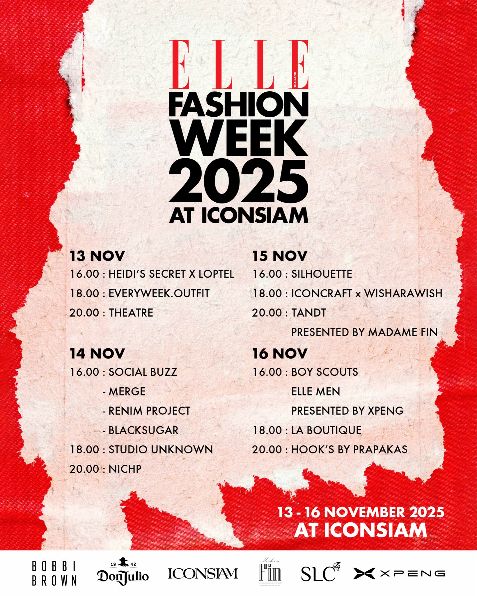 ปักหมุดไว้เลย! เปิดตารางโชว์อย่างเป็นทางการของงาน ELLE Fashion Week 2025 กับ 11 โชว์จาก 13 ไทยดีไซเนอร์ พร้อมด้วยอีกหนึ่งโชว์พิเศษจาก ELLE MEN ณ ริเวอร์พาร์ค ไอคอนสยาม ในวันที่ 13-16 พฤศจิกายน 2025 #EFW2025 #SeeYouAtTheTent#ELLEThailand#ELLEMENThailand#EFW25ATICONSIAM pic.twitter.com/wI1qaiJu1v