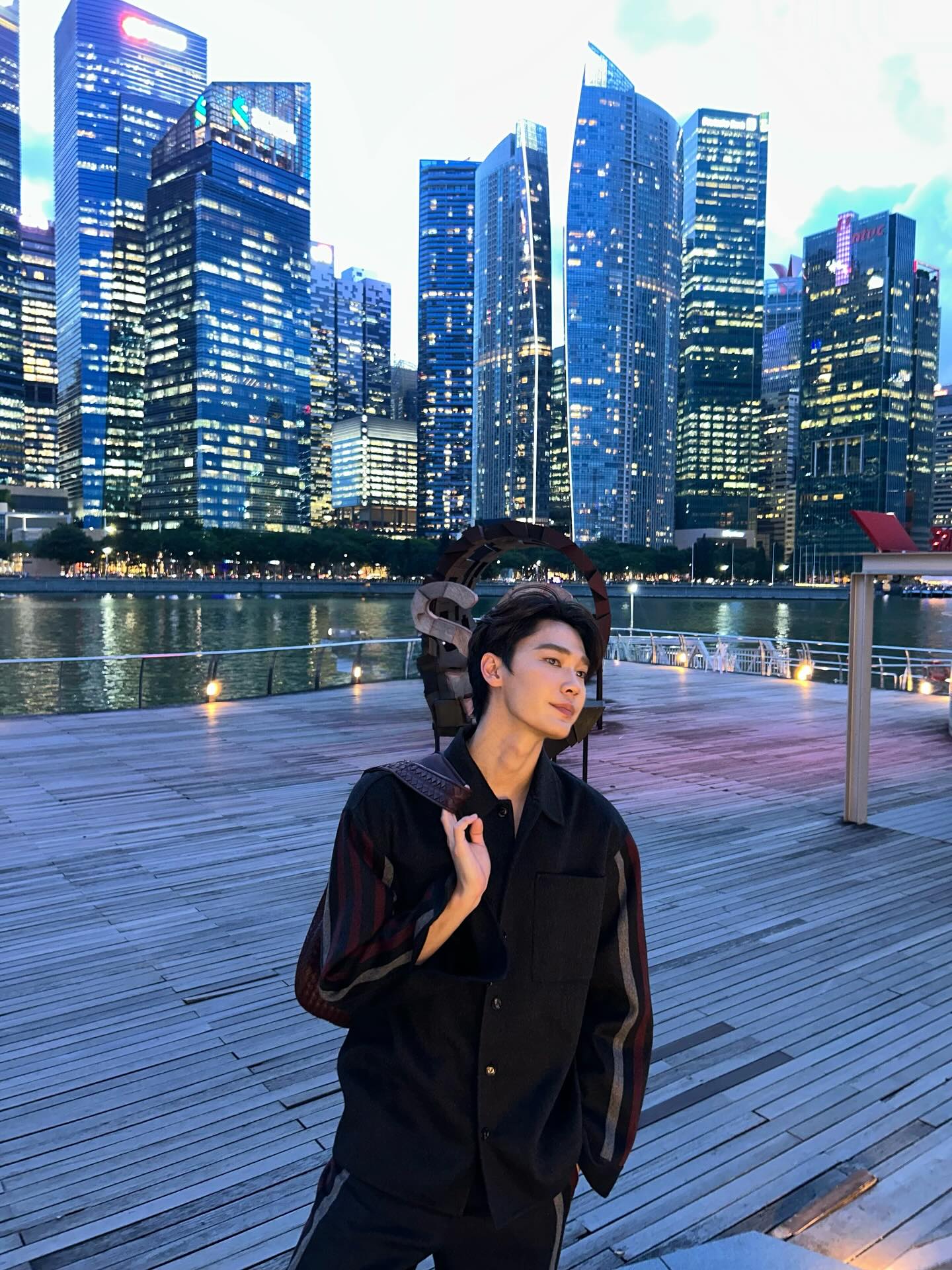 夜のマリーナベイを背景にした洗練されたスタイルが印象的です。