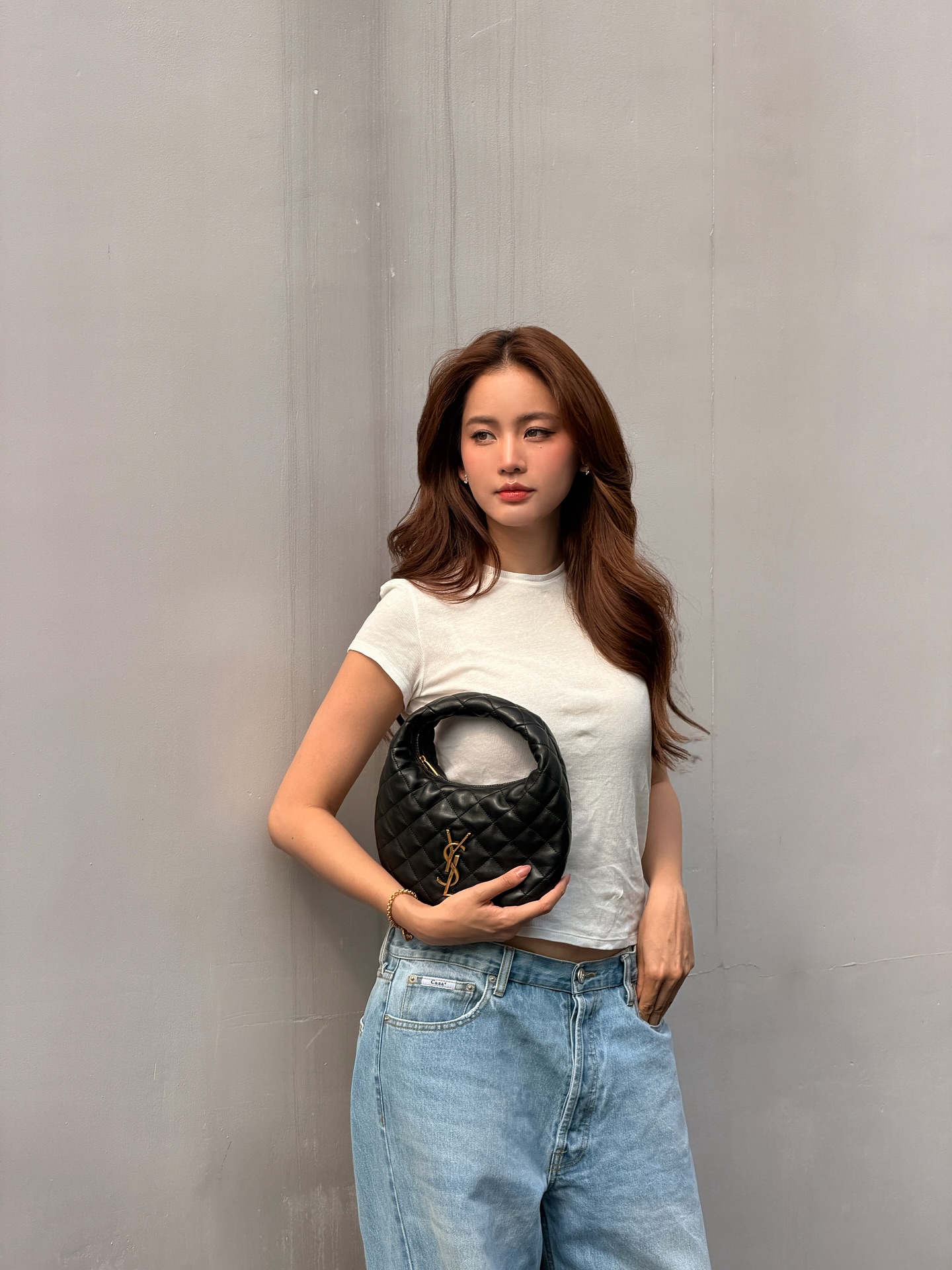 一見ラフな組み合わせながら、手にしているYves Saint Laurent(イヴ・サンローラン)のキルティングバッグが、全体をぐっと引き締めるアクセントに。