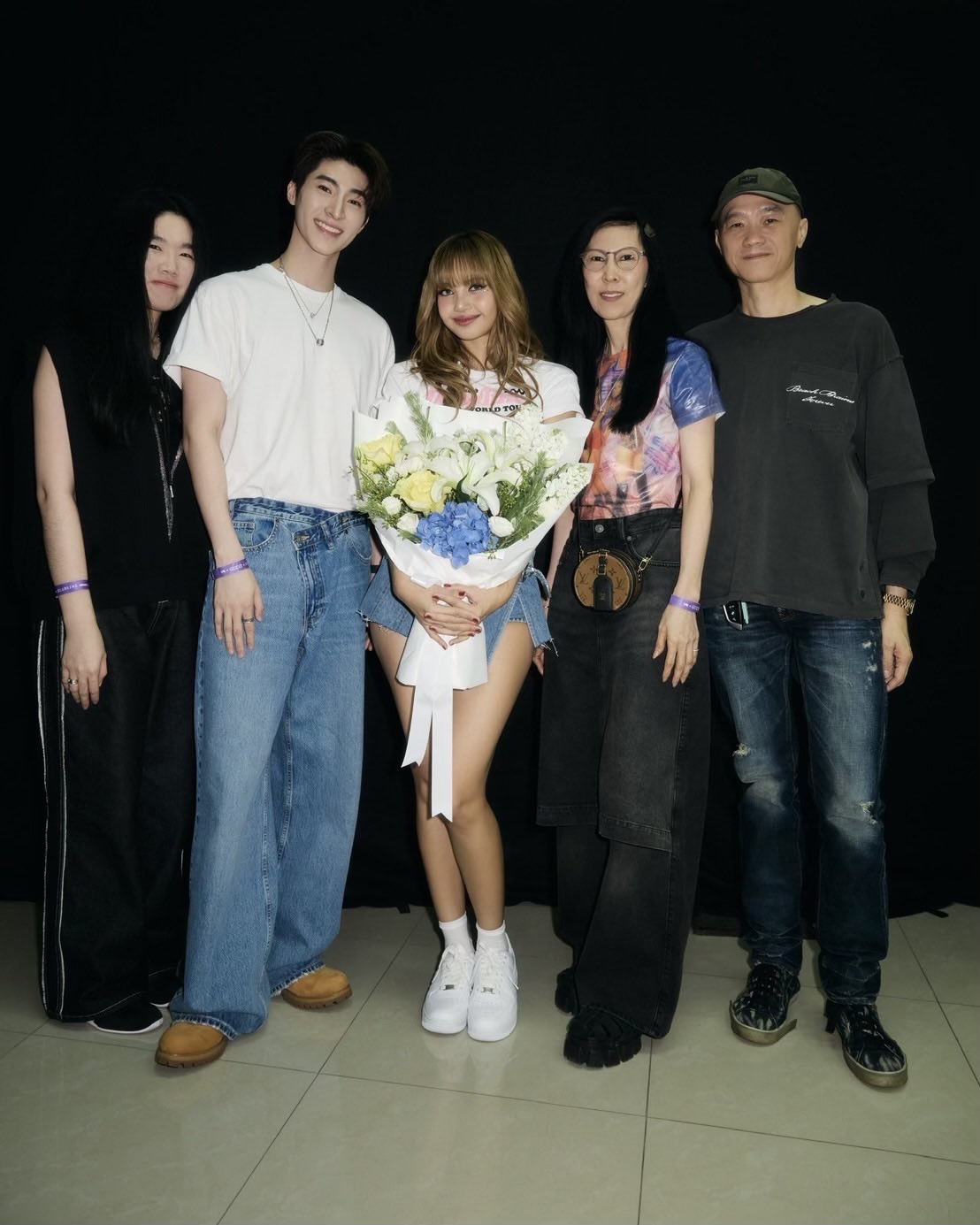 公演後にバックステージで撮影された写真には、白いTシャツとワイドデニムパンツ姿のブルーと、白いTシャツにデニムショートパンツを着用したリサが笑顔で並んでいる様子が収められています。リサは、白、黄色、青の紫陽花で彩られた美しい花束を手にして、その表情からは公演の成功と友人の訪問への喜びが伝わってきます。