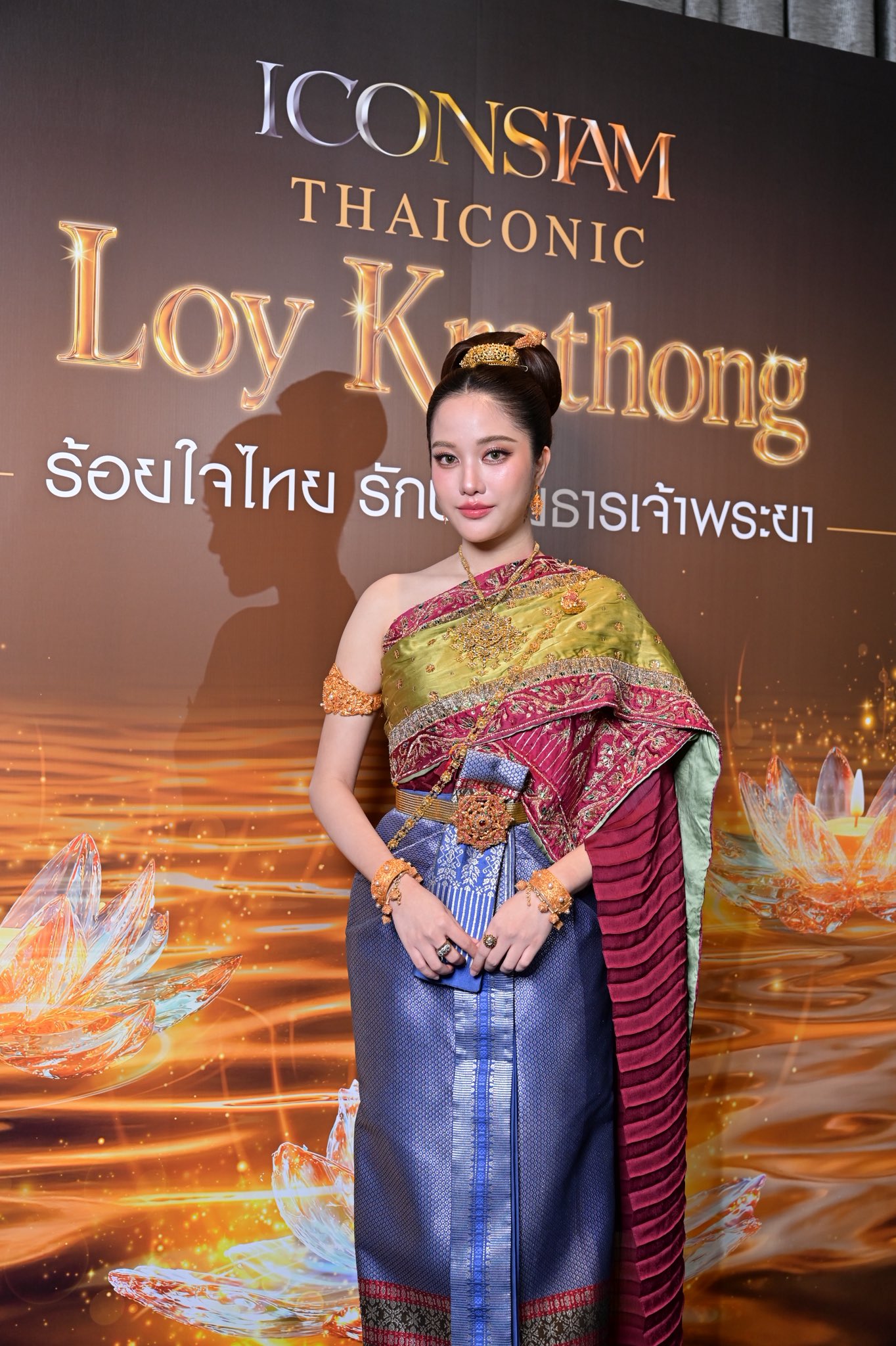 伝統的なタイ衣装「ชุดไทยจักรพรรดิ(チュット・タイ・チャクラパット)」を身にまとい、川辺のライトアップとともに優雅な姿を披露しました。