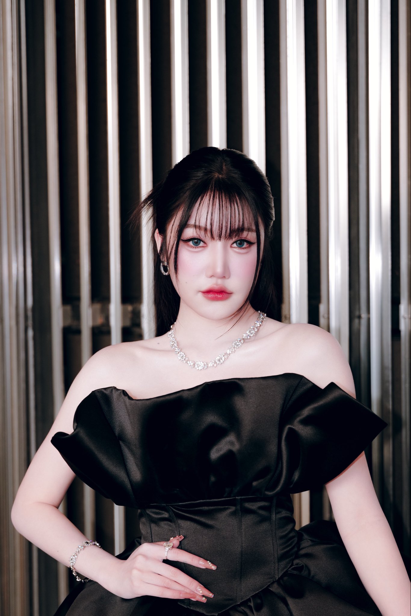 今回のイベントでは、黒のオフショルダードレスに輝くジュエリーを合わせ、エレガントな装いを披露しました。