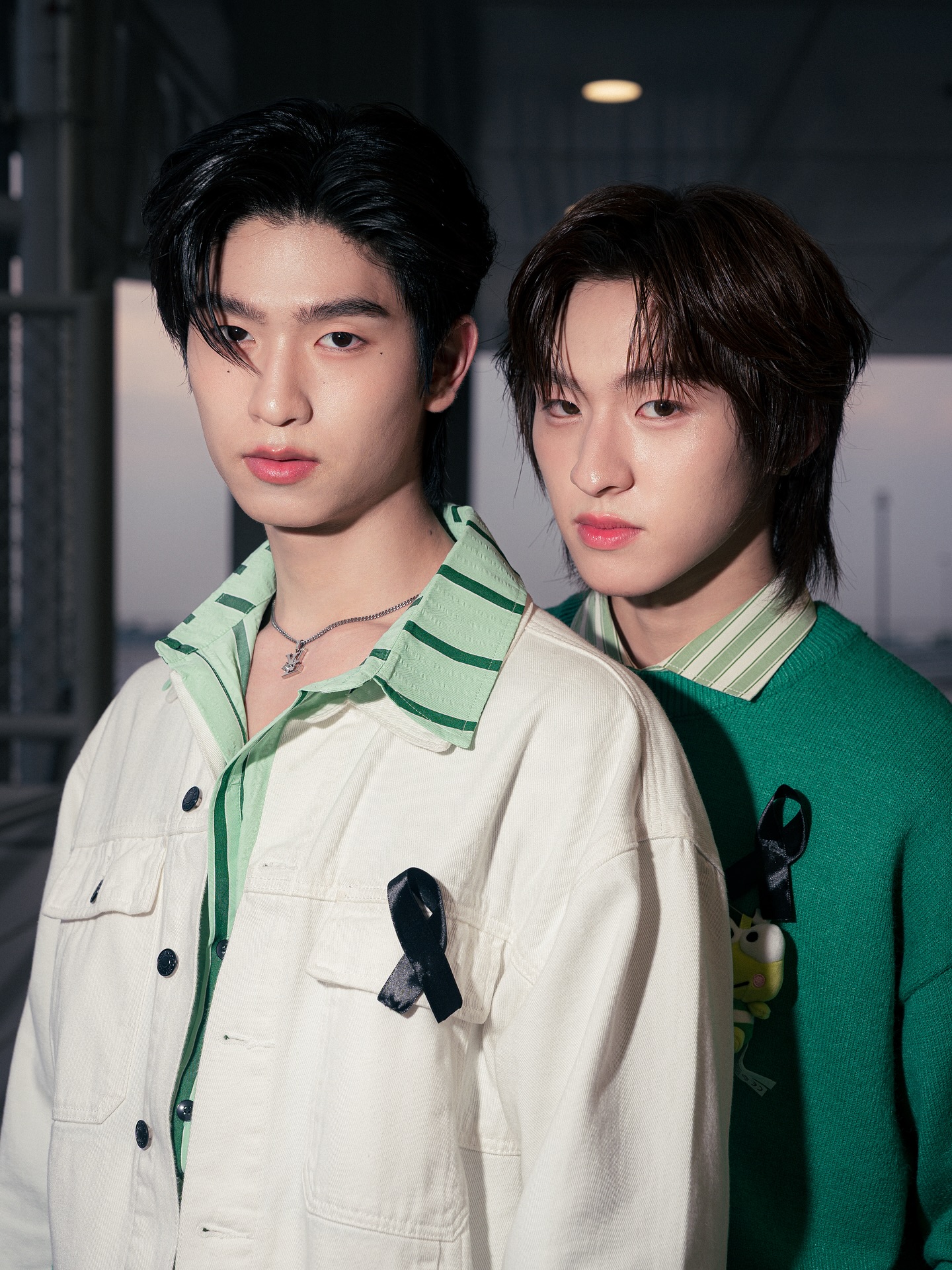 Thomasはグリーンのシャツにホワイトジャケットを合わせたスタイルで登場し、落ち着きのある大人の魅力を演出。Kongは鮮やかなグリーンのセーターに白のパンツを合わせ、明るく穏やかな存在感を放っています。