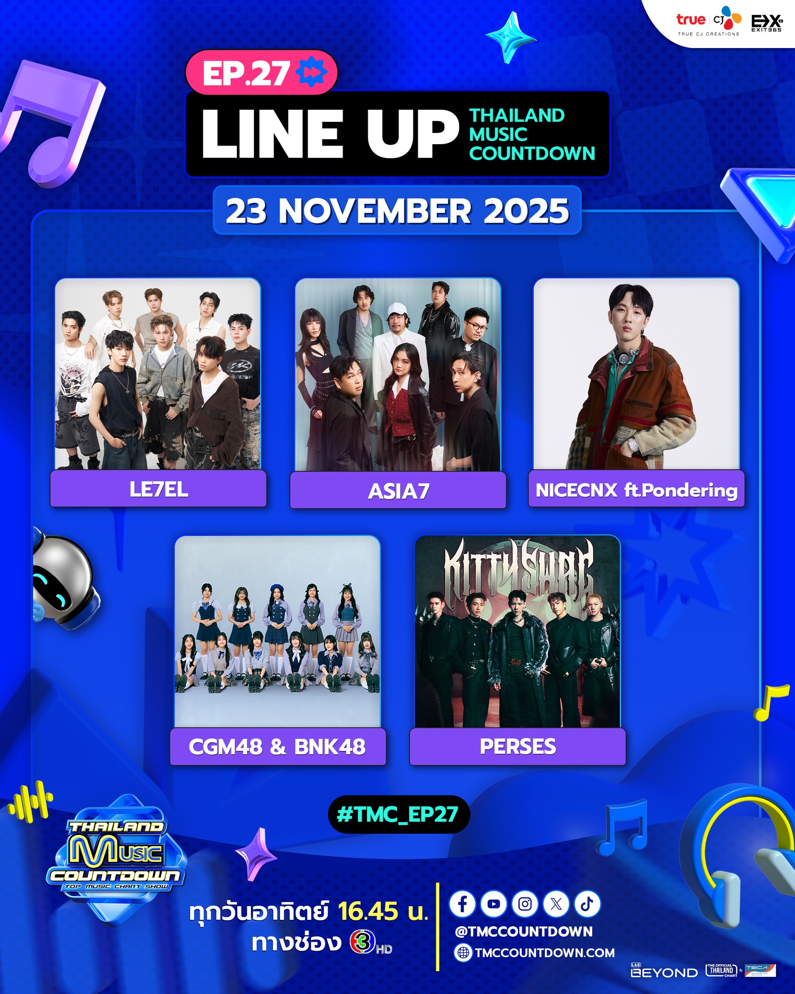 「Thailand Music Countdown」第27回エピソードでは、大型ボーイズグループから姉妹グループの特別コラボまで、グループアーティストを中心とした豪華ラインナップを届けます。さらに、ソロアーティスト同士のコラボレーションも交え、多彩な個性が融合する見応えたっぷりの特別回となっています。毎週日曜日放送の本番組ではタイ音楽シーンを代表するアーティストによる、多彩で迫力満点のパフォーマンスが満載です。