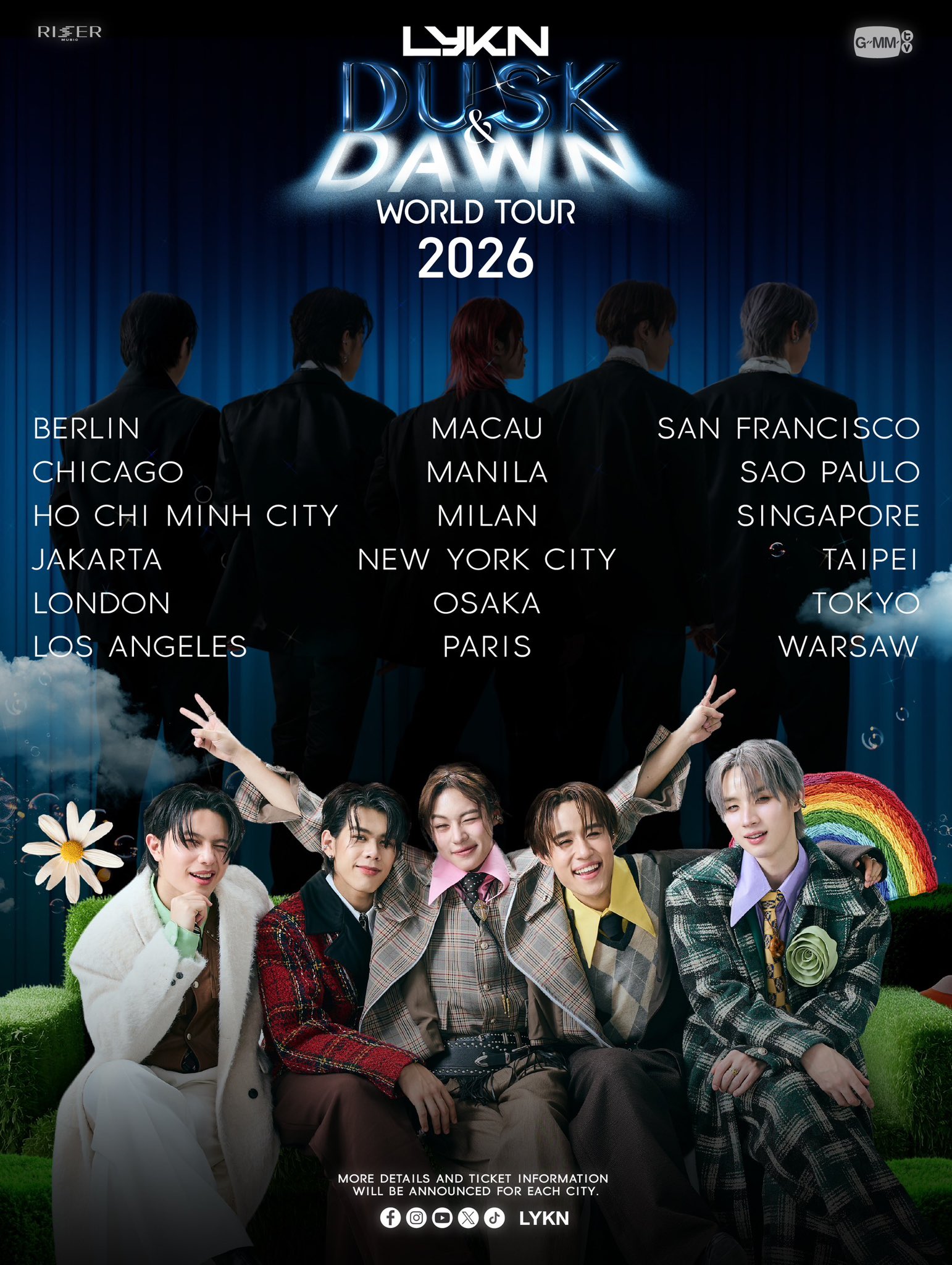 タイの人気ボーイズグループ・LYKN(ライキャン)の所属レーベルRISER MUSIC(ライザー・ミュージック)が、2026年に開催される「DUSK & DAWN WORLD TOUR 2026(ダスク&ドーン・ワールドツアー2026)」の開催都市を発表しました!