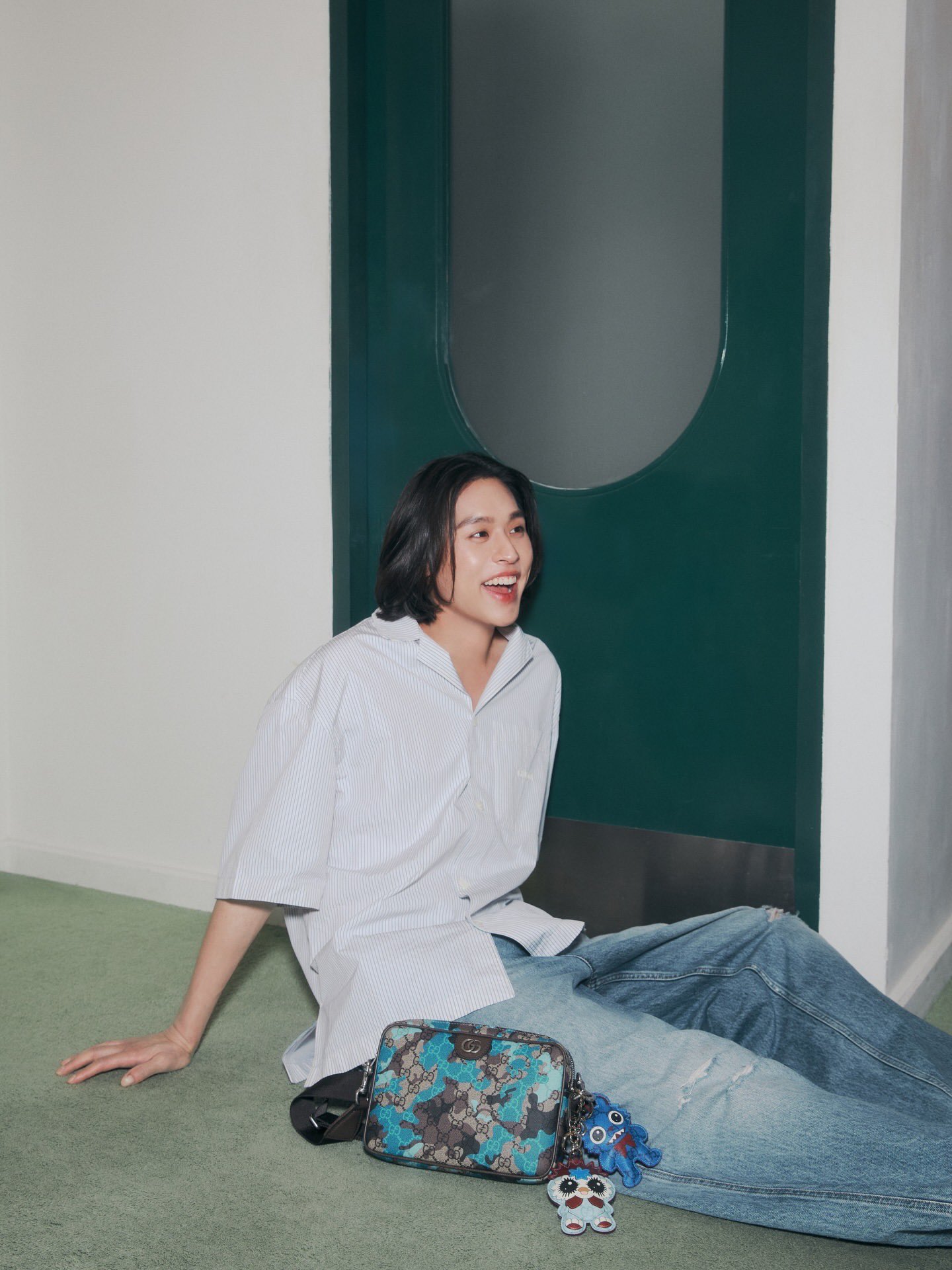 リラックスした立ち姿や座りショットでは、ビウキンらしい自然体の雰囲気が際立っており、柔らかな表情からは撮影を楽しんでいる様子が伺えます。シンプルなファッションの中にさりげなく光るGUCCIのアイテムが、ビウキンの魅力をより引き立てています。