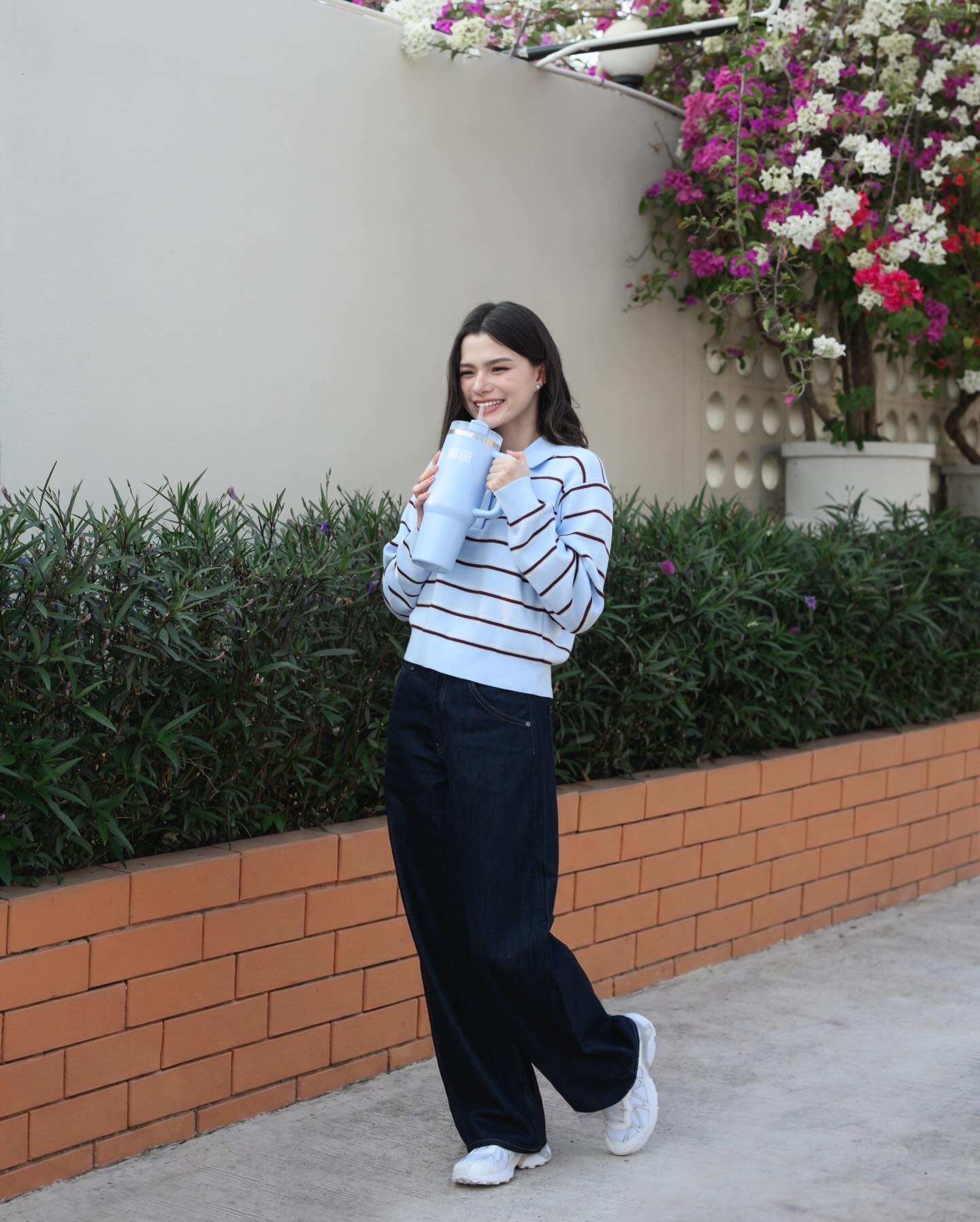 投稿では、ユニクロ(@uniqlo_thailand)が実施する感謝祭イベントの一環として、購入特典として用意されたTumbler 40oz(約1.18L)をPR。ベッキーは淡いパステルカラーのタンブラーを手に、ナチュラルで親しみやすいコーディネートでその魅力を伝えています。