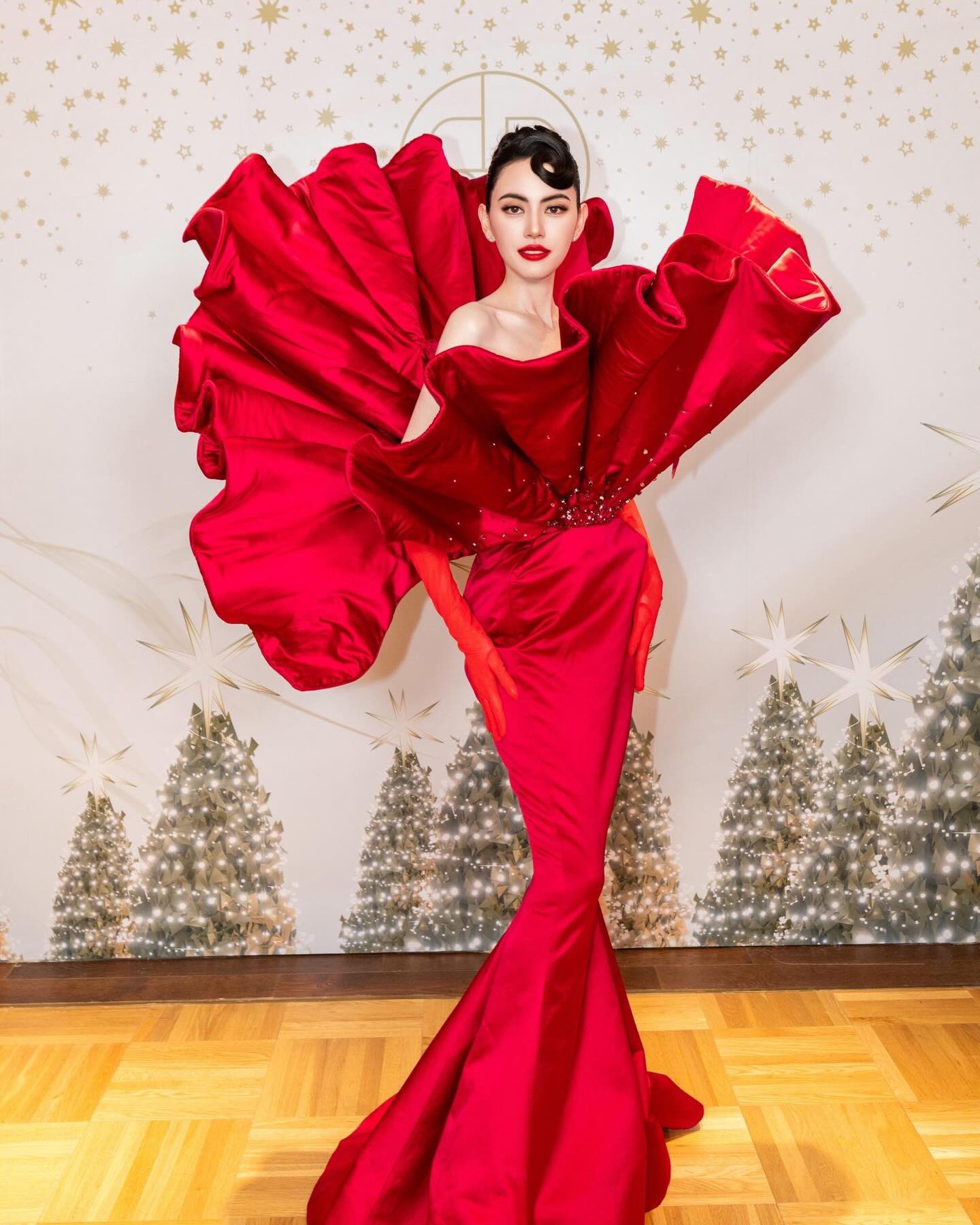 公開された写真では、立体的なフリルが花のように広がる印象的なレッドドレスをまとい、アート作品の前やラグジュアリーな空間でポーズを取る姿が収められています。会場ごとに異なる背景とともに、Mai Davikaの存在感とエレガントな佇まいが際立つ内容となっています。