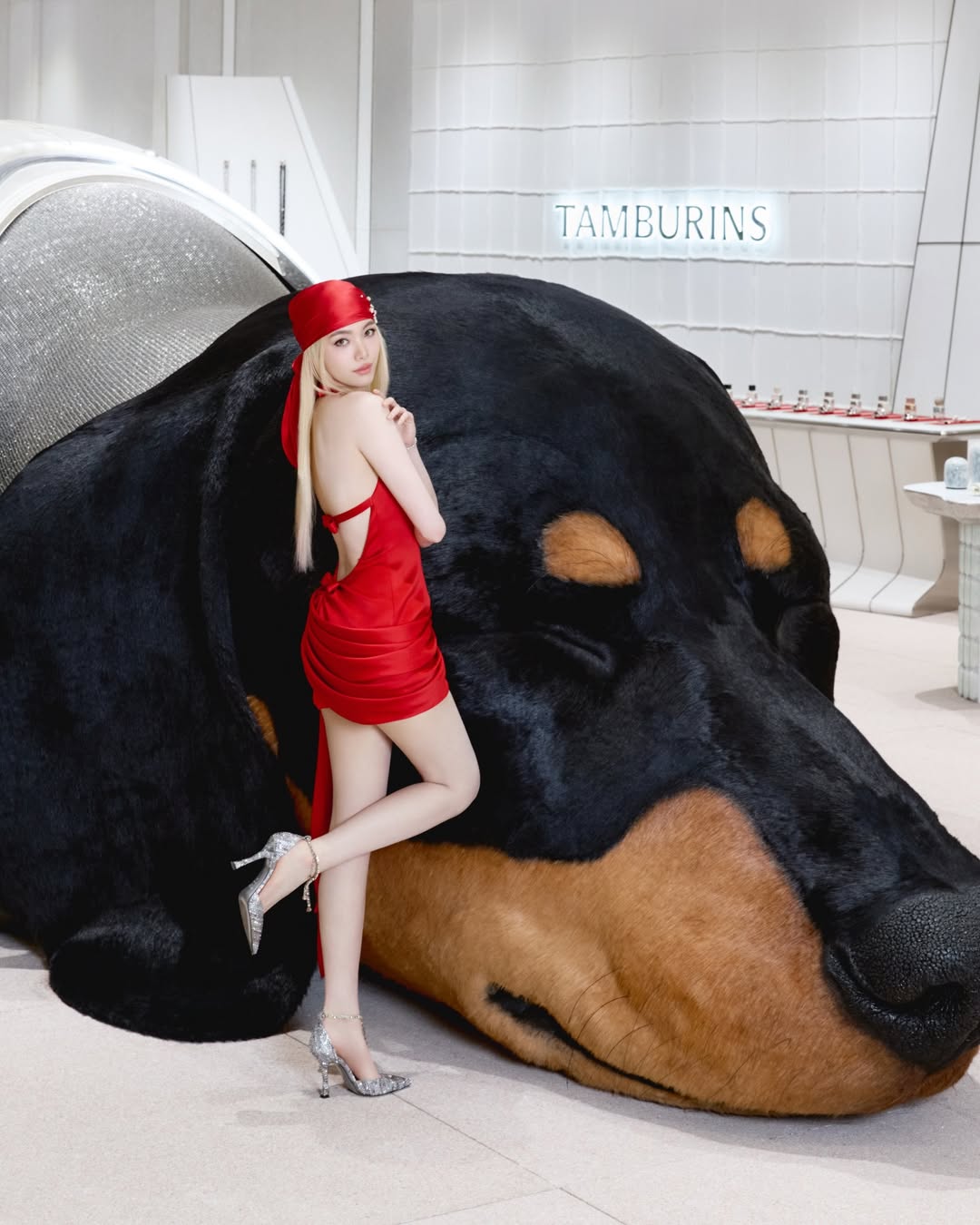 また、赤を基調としたルックでは、空間そのものを作品の一部のように取り込み、視線を惹きつける大胆な表現も披露。Gentle Monsterならではの前衛的なデザインと、TAMBURINSが持つアートピースのような香りの世界観が重なり合う中で、オームの多彩な魅力が引き出されています。