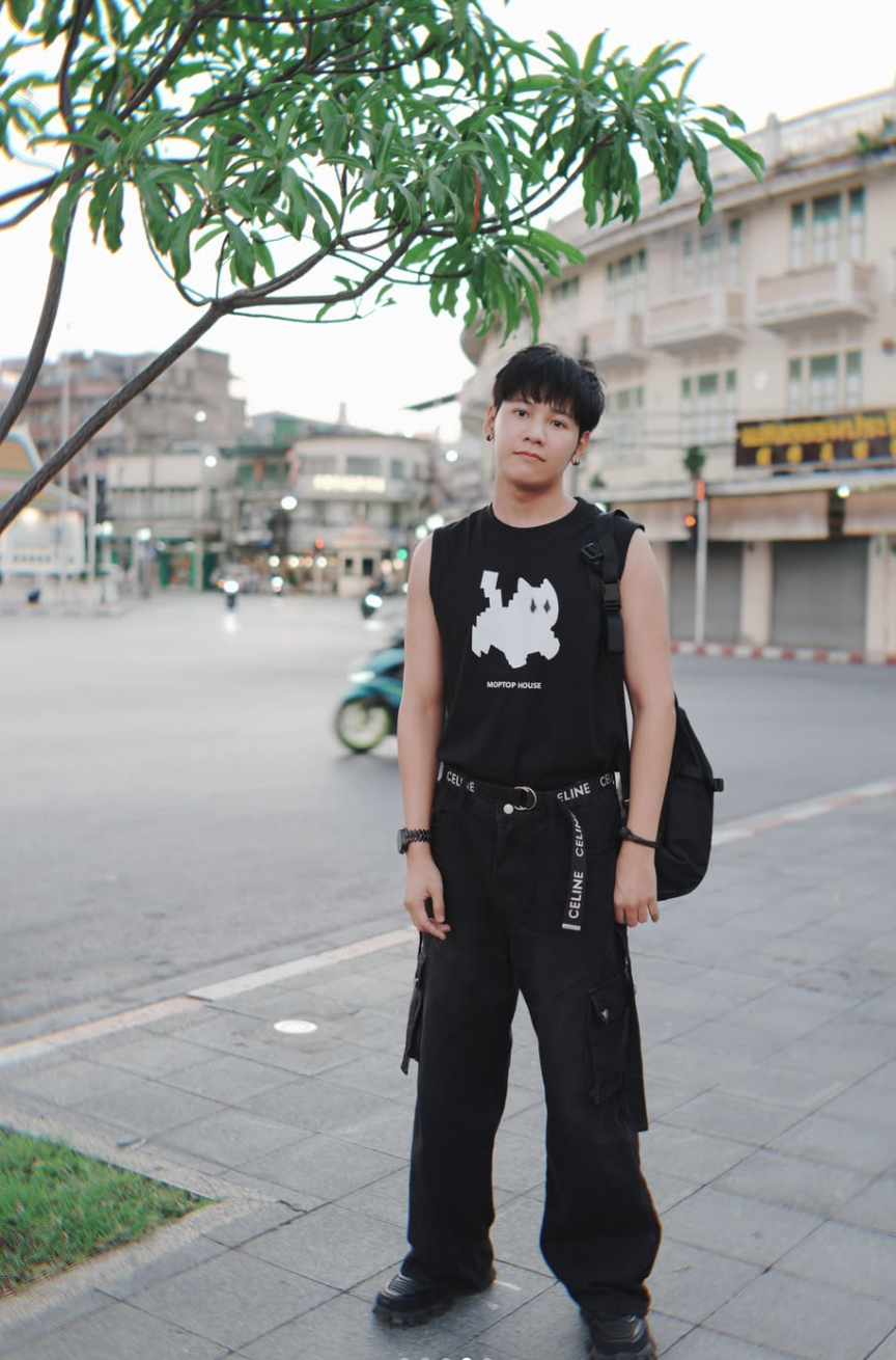 今回公開されたのは、夕暮れ時のバンコクの街角で撮影された一連の写真。ノースリーブのブラックコーデにバックパックを合わせたシンプルな装いで、信号待ちの交差点や歩道に立つ姿が印象的です。カメラ目線のカットでは柔らかな笑顔も見せ、リラックスした空気感が伝わってきます。