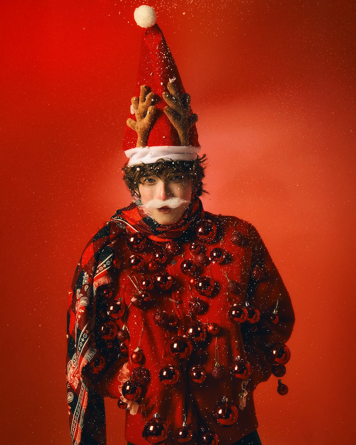 トナカイの角が付いたサンタハットに、赤いオーナメントをまとったニット、フリルの襟元など、細部までこだわりが感じられるスタイリングが印象的です。
