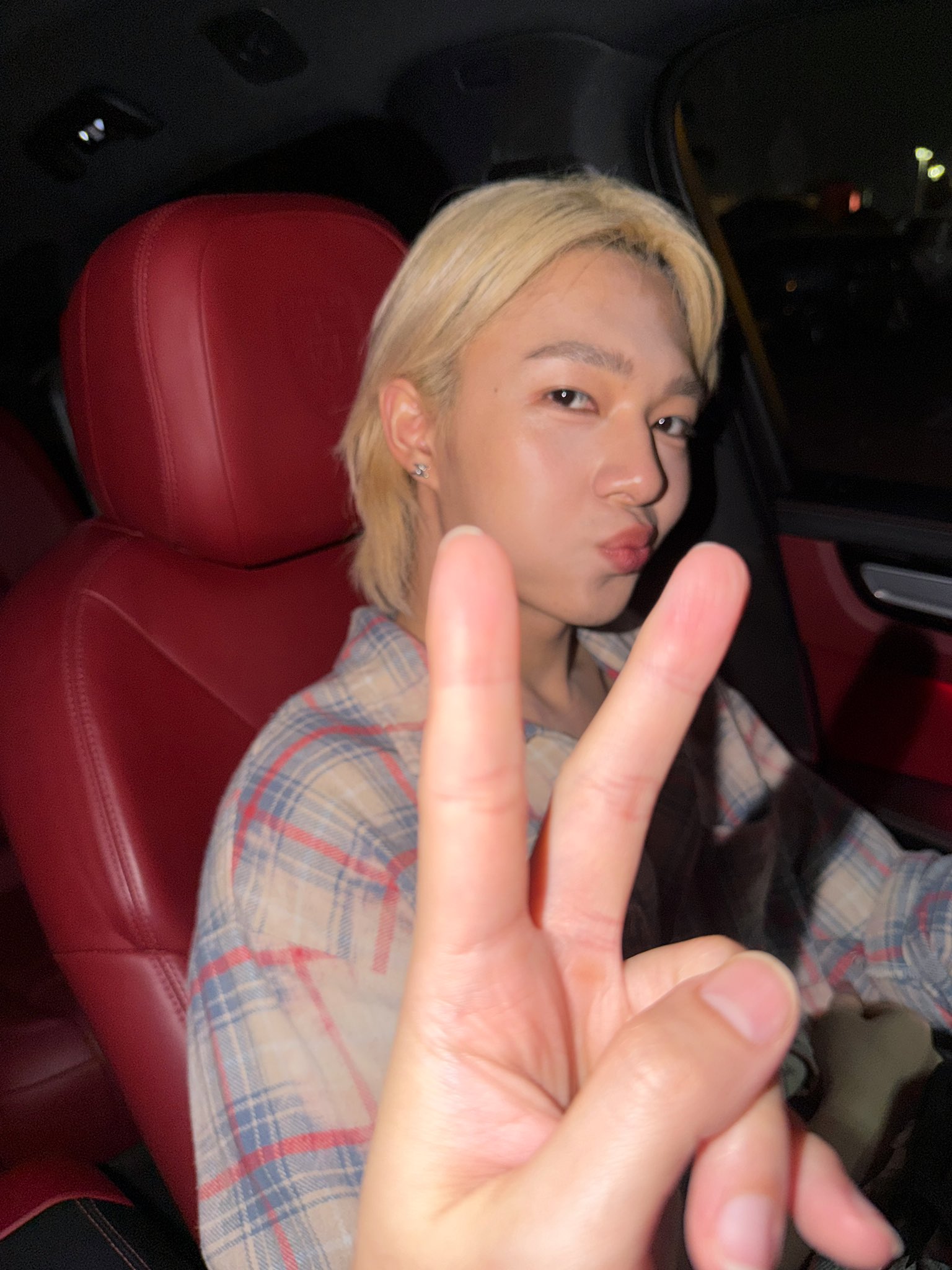 公開されたのは、夜の車内でZeeが運転席から助手席に座るNuNewを撮影した写真。カメラを向けられた NuNew Chawarin は、ピースサインをしながらも、どこか拗ねたようにほっぺたをぷくっと膨らませた表情を見せており、その愛嬌たっぷりの姿に「可愛すぎる」と反響が広がりました。