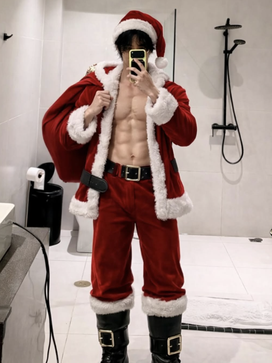 公開された写真では、サンタクロースの衣装に身を包み、鏡越しに撮影したセルフィーを披露。コスチュームの隙間からのぞく引き締まった腹筋と、リラックスした雰囲気のポージングが印象的で、ホリデーらしい遊び心と大人の色気が共存する一枚となっています。