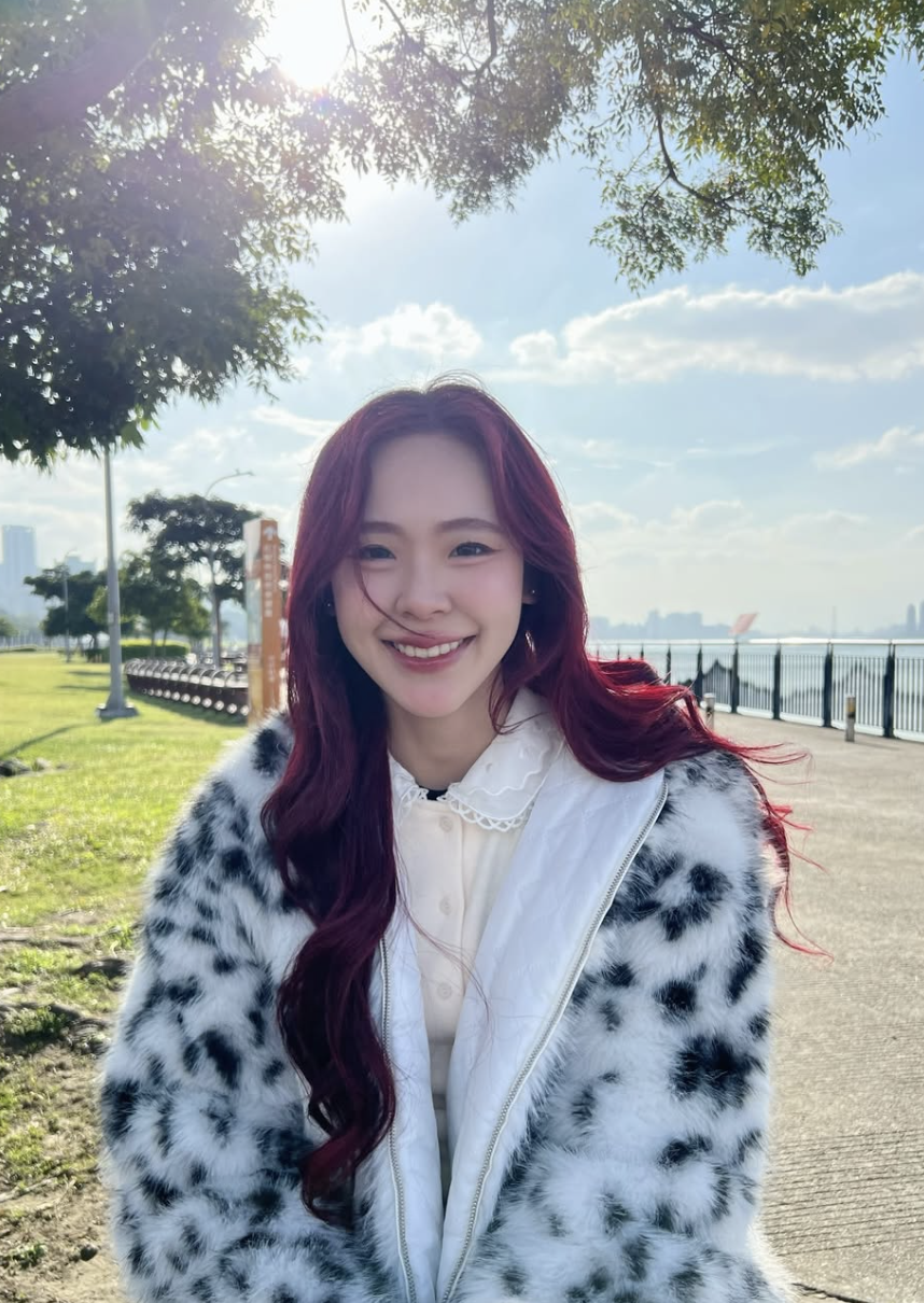 公開された写真には、湖畔のベンチに腰掛けて景色を眺める後ろ姿や、カメラを手に自然な笑顔を見せるジューンの姿が収められており、旅先でのリラックスした空気感が伝わってきます。赤みがかったヘアカラーと、柔らかな印象のファーコートも印象的で、台北の爽やかな風景とよく調和しています。