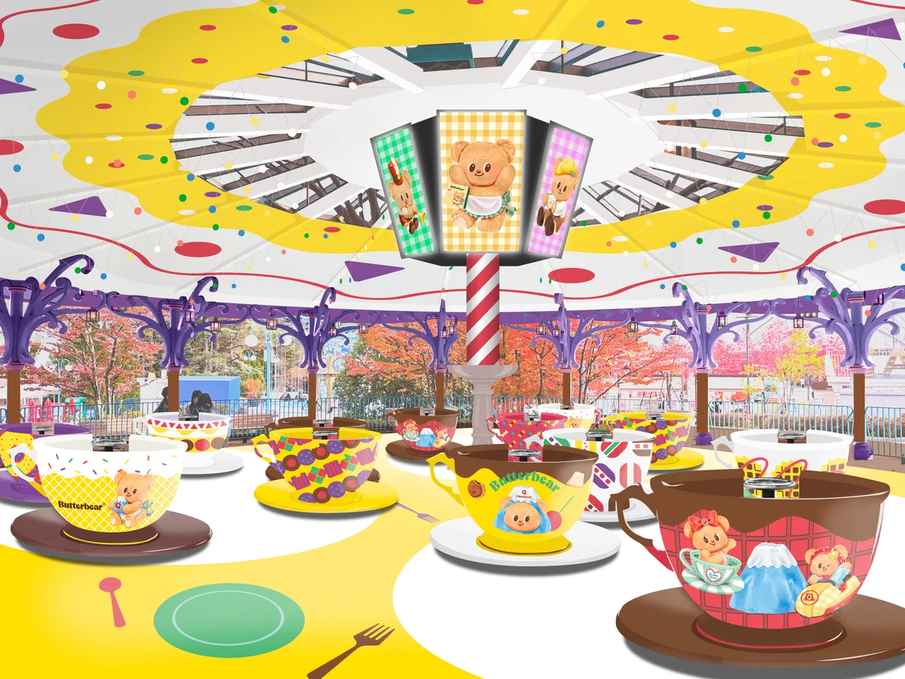 注目は、長年親しまれてきた「ティーカップ」が、コラボ仕様の新アトラクション「Par-tea CUP(パーティーカップ)」としてリニューアルされる点です。音・光・映像を駆使した演出により、まるでButterbearのパーティに参加しているかのような没入体験が楽しめます。SNS映えを意識した空間づくりも大きな魅力です。