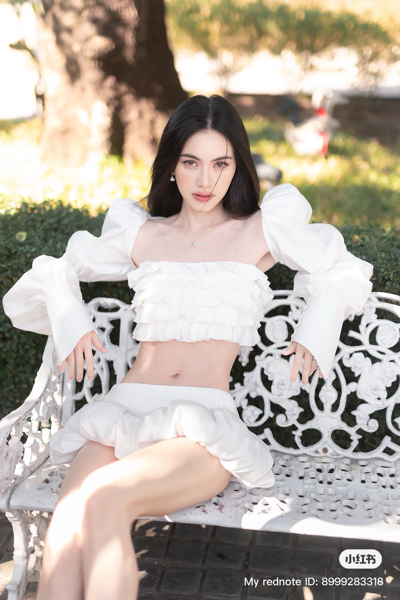 今回公開された写真では、白を基調としたフリルデザインのトップスとスカートを着用。ガーデンを思わせるロケーションとクラシカルなベンチが組み合わさり、透明感とエレガンスが際立つ仕上がりとなっています。柔らかな自然光の中で見せる表情は、可憐さと大人の余裕を併せ持ち、見る者を一瞬で引き込む存在感です。