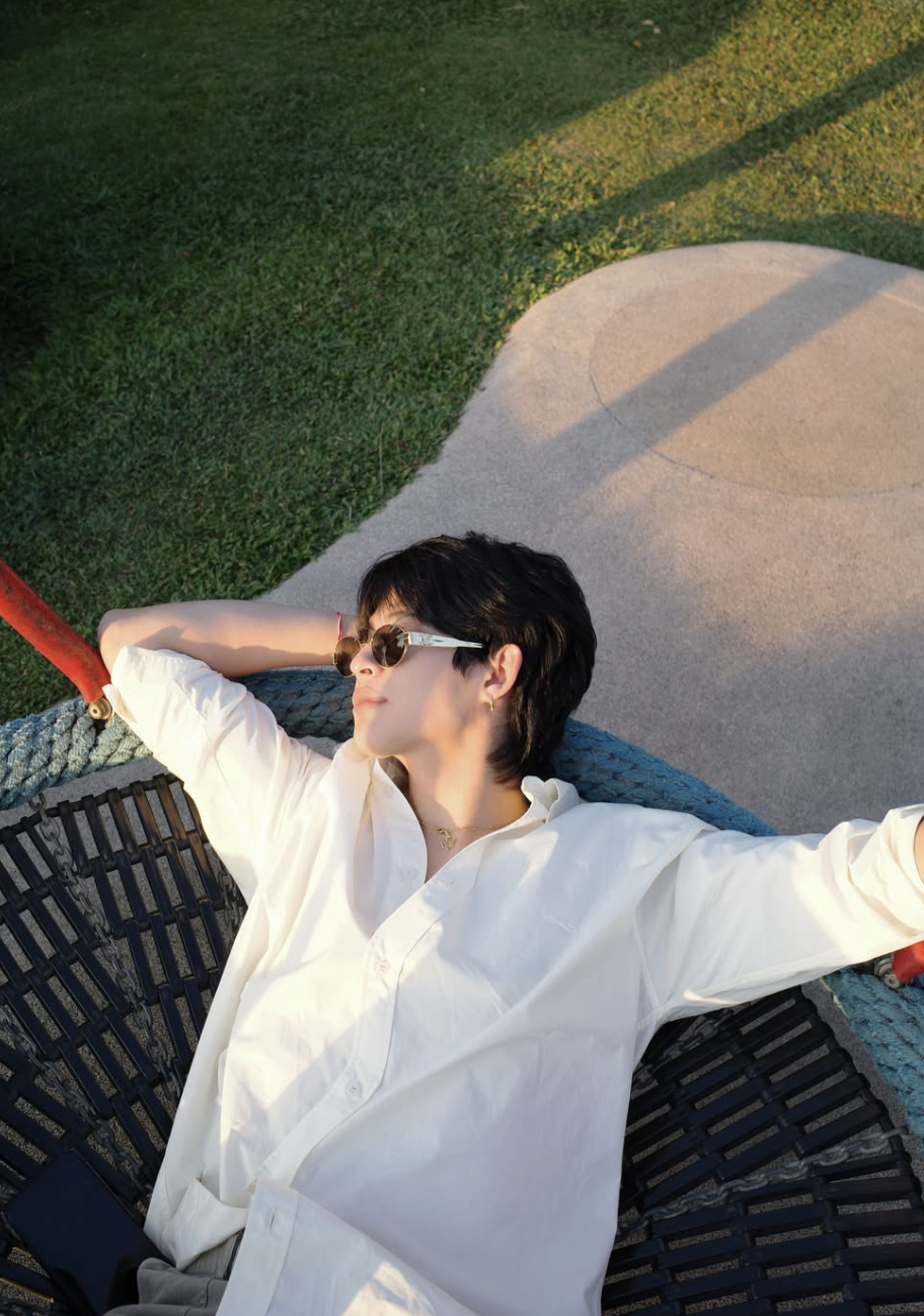 公開された写真では、芝生の上に座り込んだ自然体の姿や、白シャツにショートパンツを合わせた軽やかなスタイルが印象的。柔らかな笑顔や、モノクロ写真で見せたお茶目な表情、サングラスをかけてリラックスするカットなど、さまざまな表情が並び、穏やかな時間を楽しんでいる様子が伝わってきます。