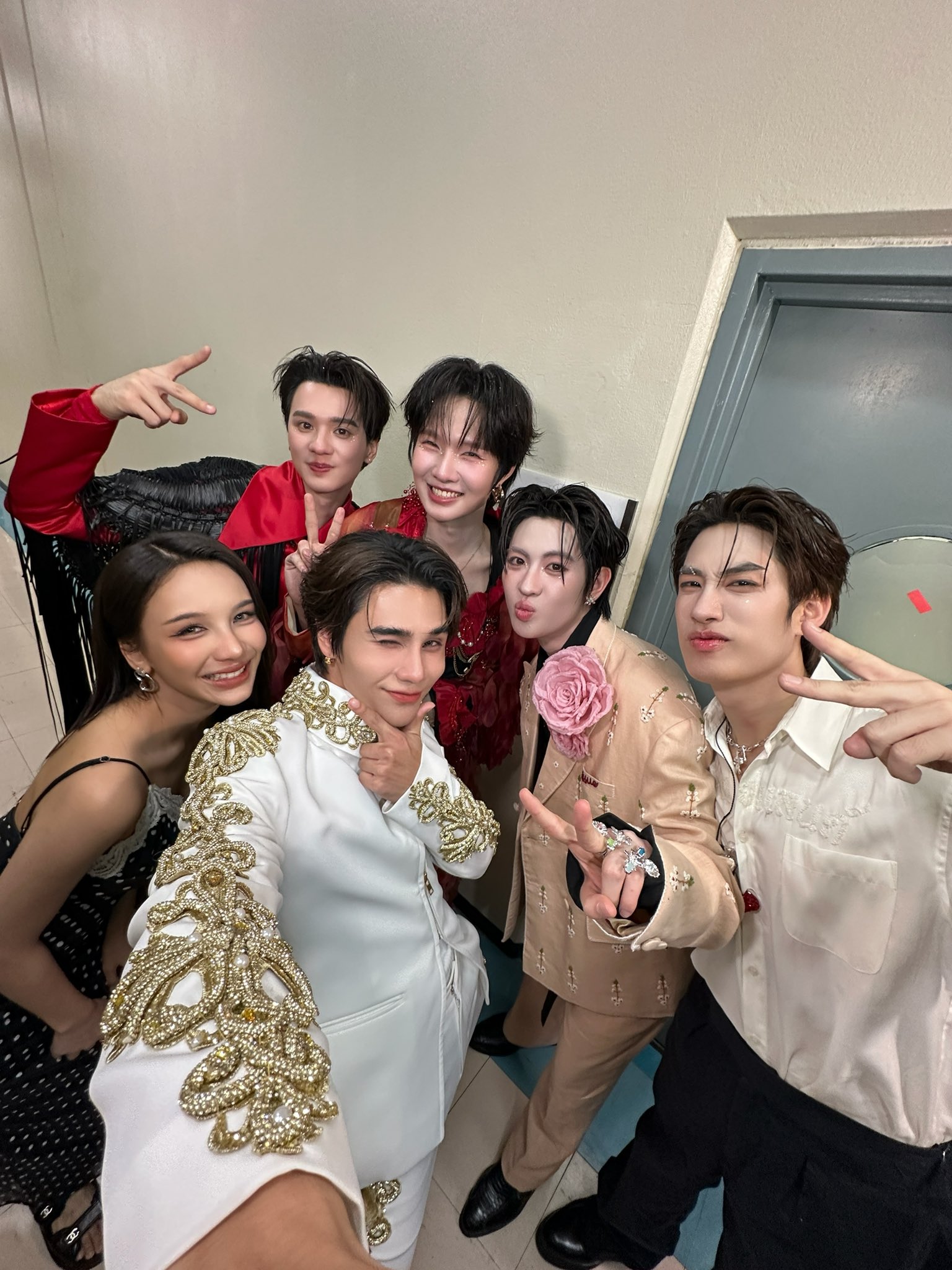 投稿されたのは、話題のタイBLドラマ『Khemjira 逃れられない呪い』の主要キャストであるKeng(ケン)、Namping(ナンピン)、Tle(トル)、FirstOne(ファーストワン)に加え、親友シンガー Bowkylion(ボーキーライオン)も一緒に撮影したバックヤードでの集合セルフィーです。華やかな衣装に身を包んだ6人の距離感の近さから、和気あいあいとした雰囲気が伝わってきます。