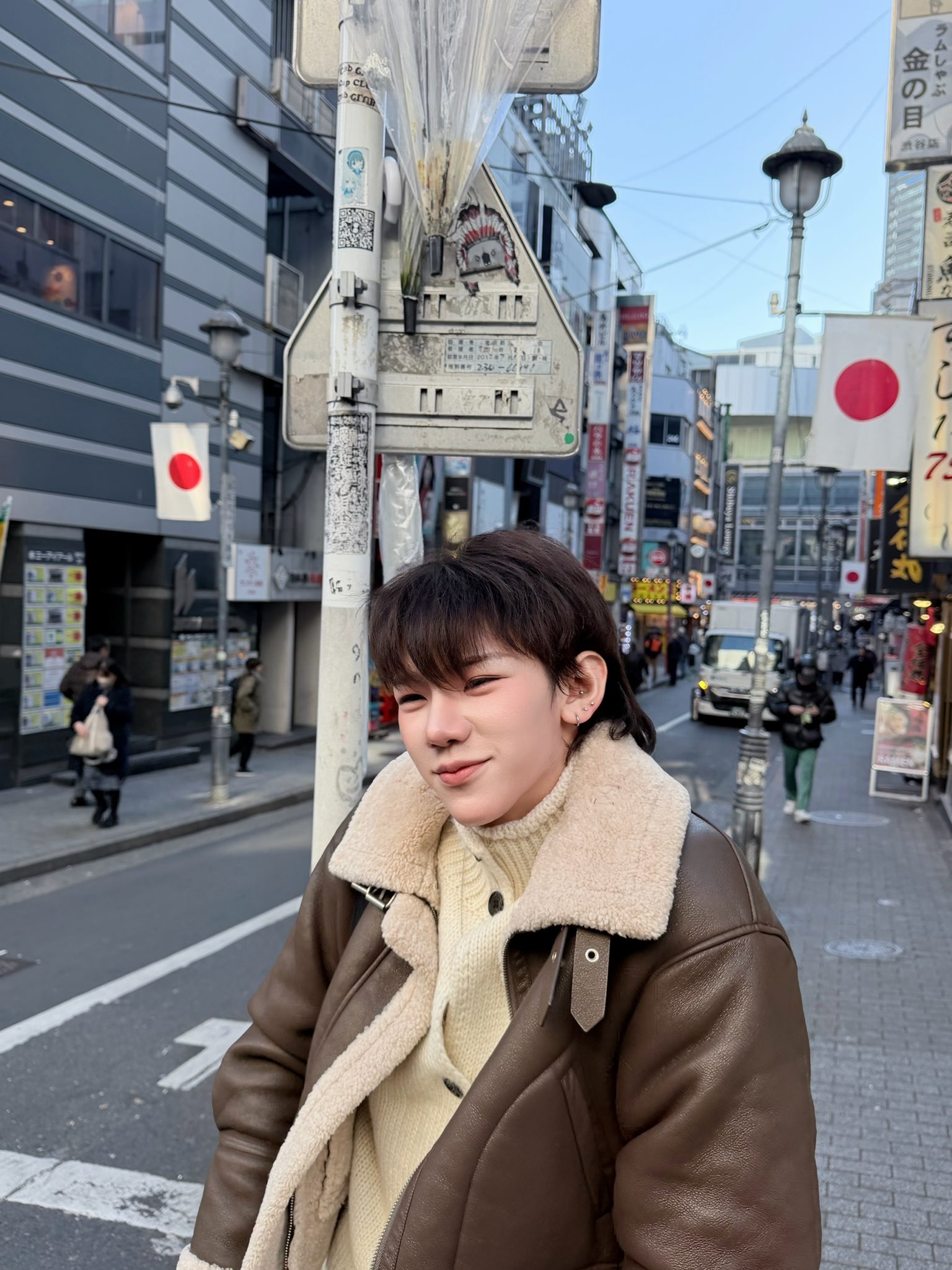 投稿には「ยังอยู่ญี่ปุ่งอยู่เรยนินาา(まだ日本にいるじゃん)」というキャプションとともに、日本の街角で撮影された複数の写真を公開しました。ブラウンのムートンジャケットにニット、デニムを合わせた冬コーデで、渋谷の風景に自然に溶け込む姿が印象的です。