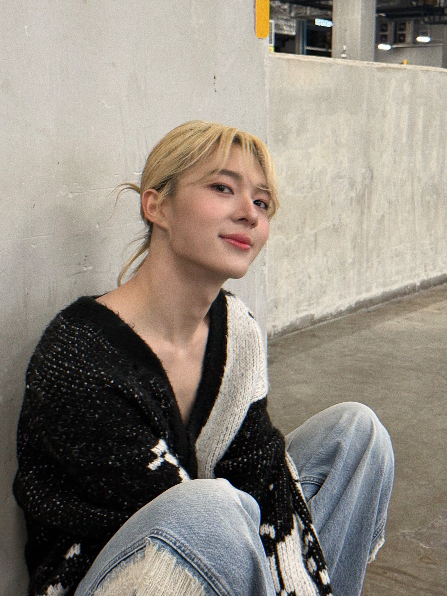 今回の投稿で彼は、モノトーンの柄が映える肉厚なニットカーディガンを主役にしたスタイリングで登場。あえてインナーを合わせず、リラックスした雰囲気でデコルテを覗かせた着こなしは、いつもの愛らしい笑顔とは一味違う、大人のアンニュイな魅力を放っています。