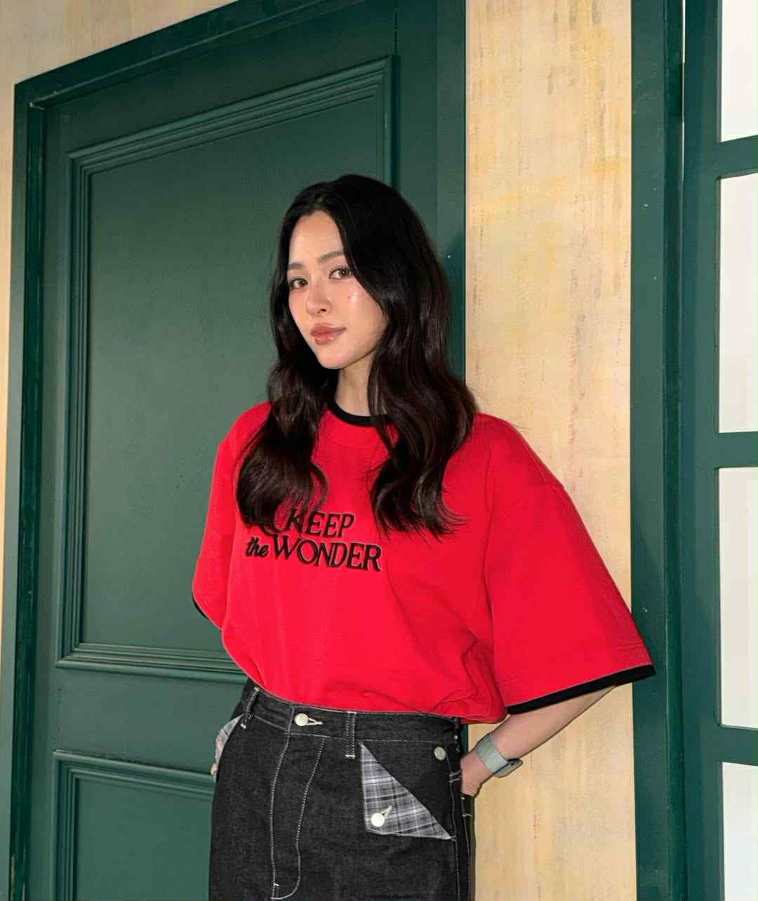 公開された画像では、鮮やかなレッドや清潔感のあるホワイトの生地に「KEEP the WONDER」のロゴが刺繍された、スポーティーで洗練されたTシャツスタイルを披露。