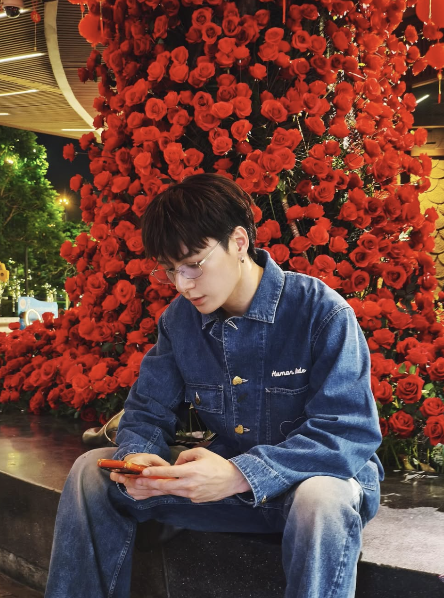 投稿されたのは、赤いバラで彩られた華やかなスポットや、夜の街のイルミネーションを背景にしたショット。デニムのセットアップにメガネを合わせたラフなスタイルで、スマートフォンを手に自然体の表情を見せています。自撮りを楽しむ姿や、ふとした瞬間を切り取ったカットからは、オフのリラックスした雰囲気が伝わってきます。