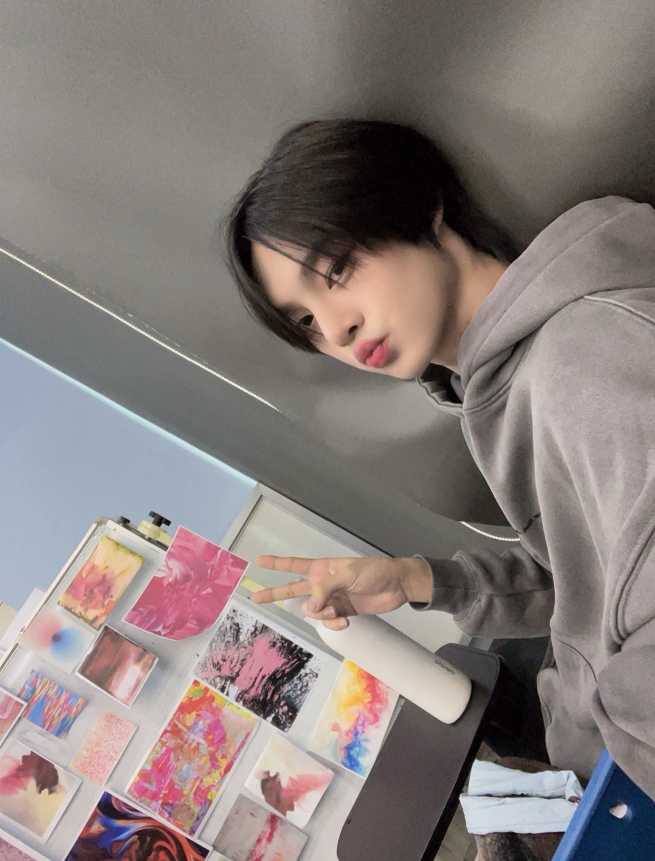 「今日はコンセプトの授業。アートが本当に好き」と綴られた投稿には、壁一面に並ぶ抽象画やカラフルな作品に囲まれた空間と、リラックスした表情のOttoの姿が収められています。フーディ姿のナチュラルなビジュアルは、作り込まれていないからこそ際立ち、まるで作品の一部のような存在感を放っています。