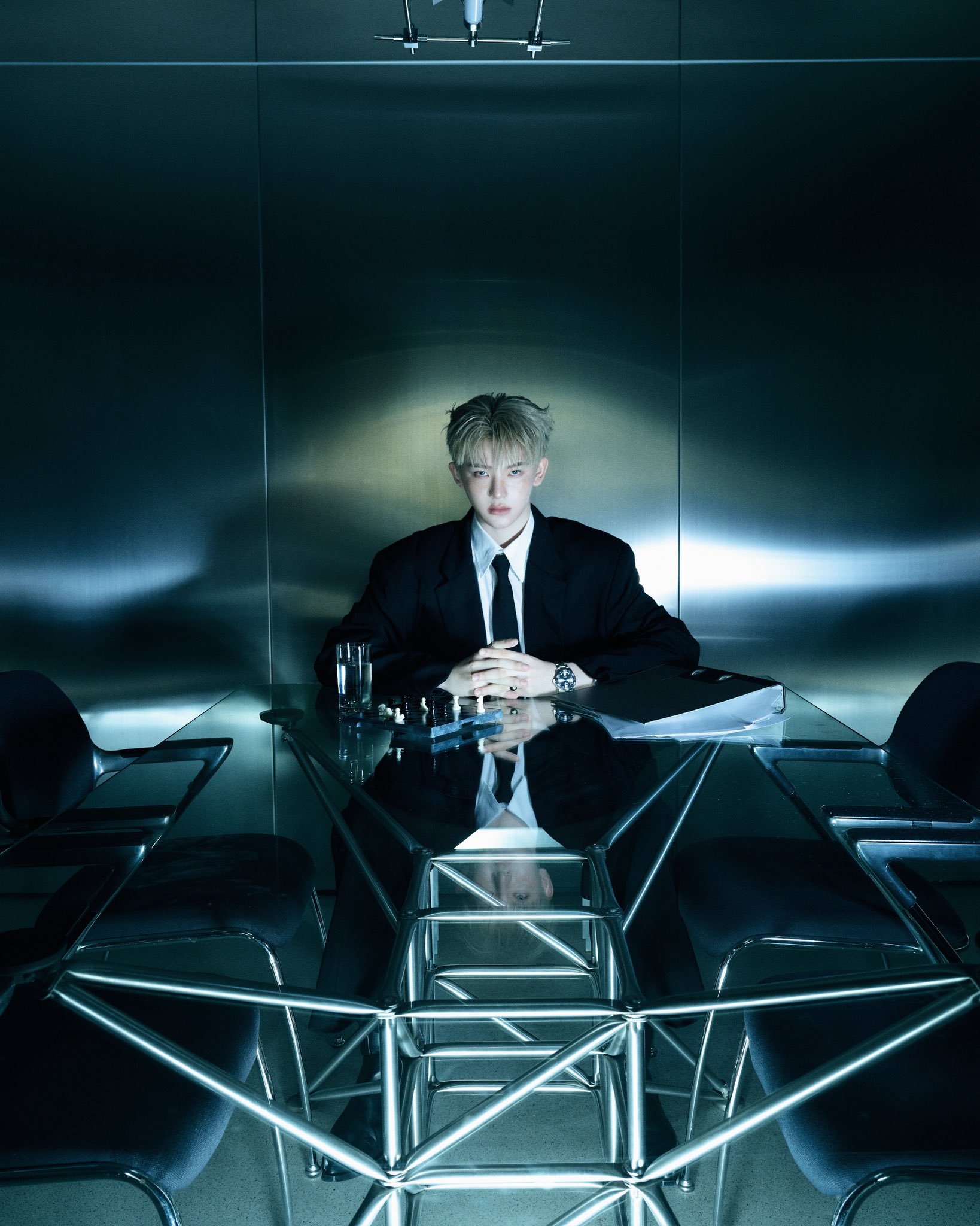 今回公開された写真でPoomは、タイトな黒のスーツに白シャツ、細身のネクタイを合わせた王道のフォーマルスタイルで登場しました。近未来的なシルバーの壁や、無機質なオフィスデスクを背景に、冷徹さと色気が同居する「デキる男」を見事に演じきっています。
