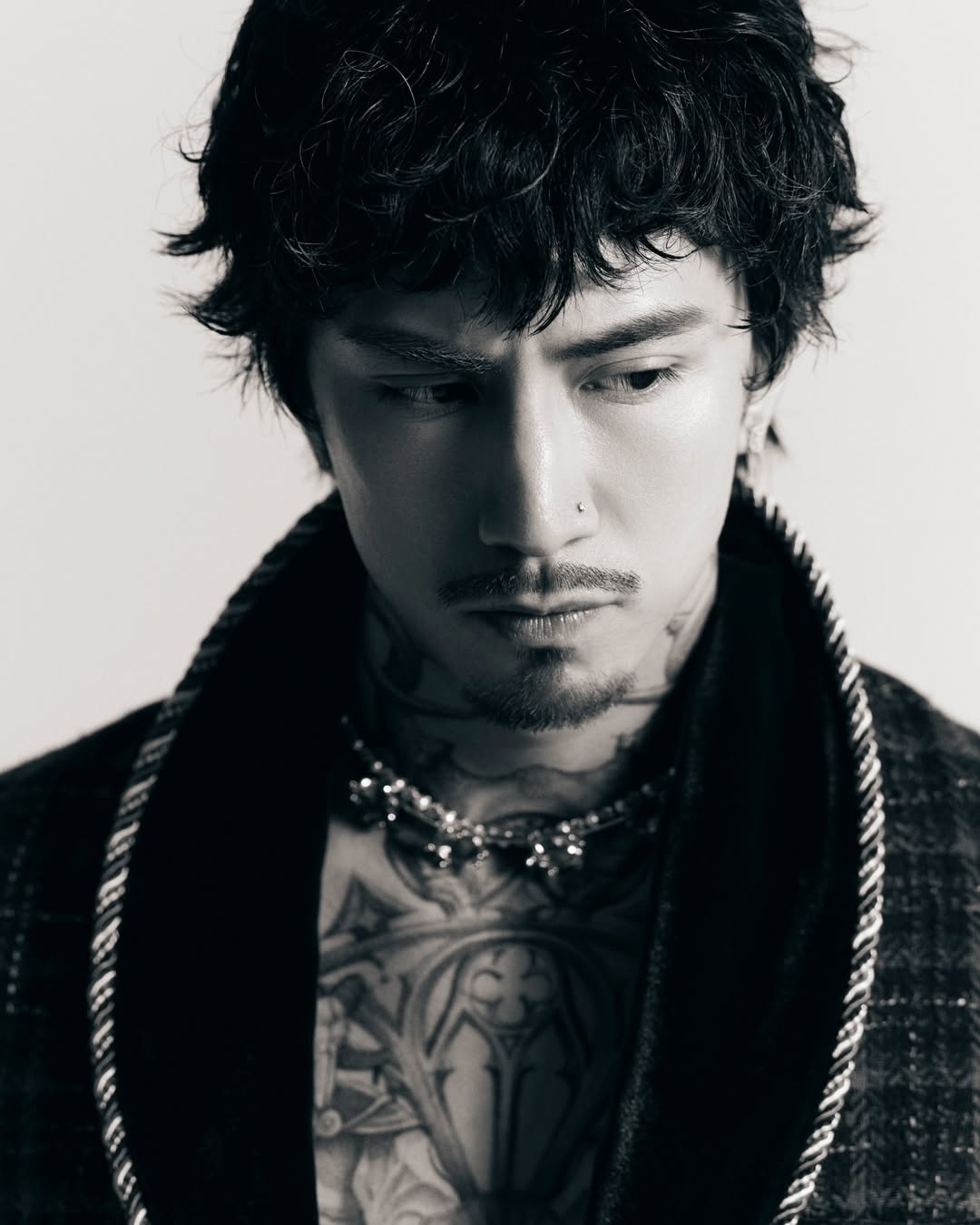 今回の撮影で彼が身に纏っているのは、タイを拠点に独創的な世界観を展開する気鋭ブランド「Vanillin Studio」のアイテムです。このブランドは、デザイナーのJae Kwoung LeeとBenjana Charoensomsamaiの二人によって設立され、衣服という枠を超えてアートや工芸を融合させた「共に創り上げる」物語を大切にしています。さらに世界的なジュエリーブランド「Swarovski(スワロフスキー)」が華を添え、彼の首元には煌びやかなネックレスが光ります。素肌の上に直接羽織った重厚感のあるチェック柄のジャケットは、深いベルベットのラペルとゴールドのパイピングが施されたクラシックなデザインで、彼の象徴とも言えるダイナミックなタトゥーとのコントラストが絶妙な色気を醸し出しています。