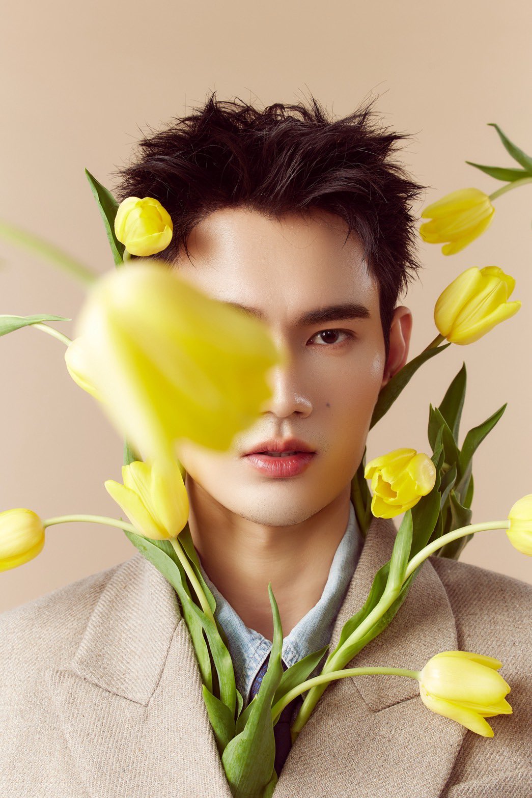 公開された写真の中では、パベルの端正なビジュアルを花々が彩るだけでなく、素肌にテープで直接花を貼り付けたカットや、頬にてんとう虫が止まった神秘的なクローズアップなど、独創的な演出が光ります。シャネル(CHANEL)のパールネックレスを重ね付けしてデイジーの絨毯に横たわる姿は、まさに現代の「花の王子」と呼ぶにふさわしい気品を放っています。