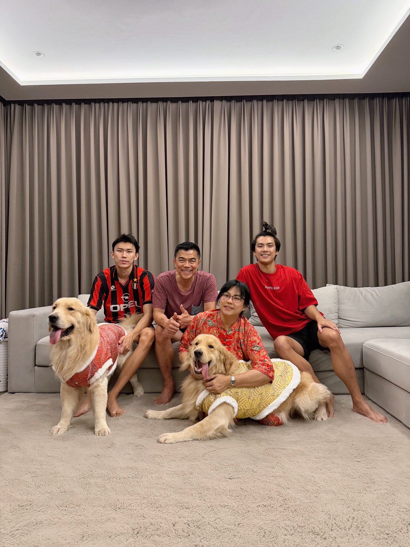 「春節快楽(旧正月おめでとう)」という温かいメッセージとともに投稿された写真には、赤い衣装に身を包んだ家族と、愛犬のGold、そしてDennの姿が映し出されています。