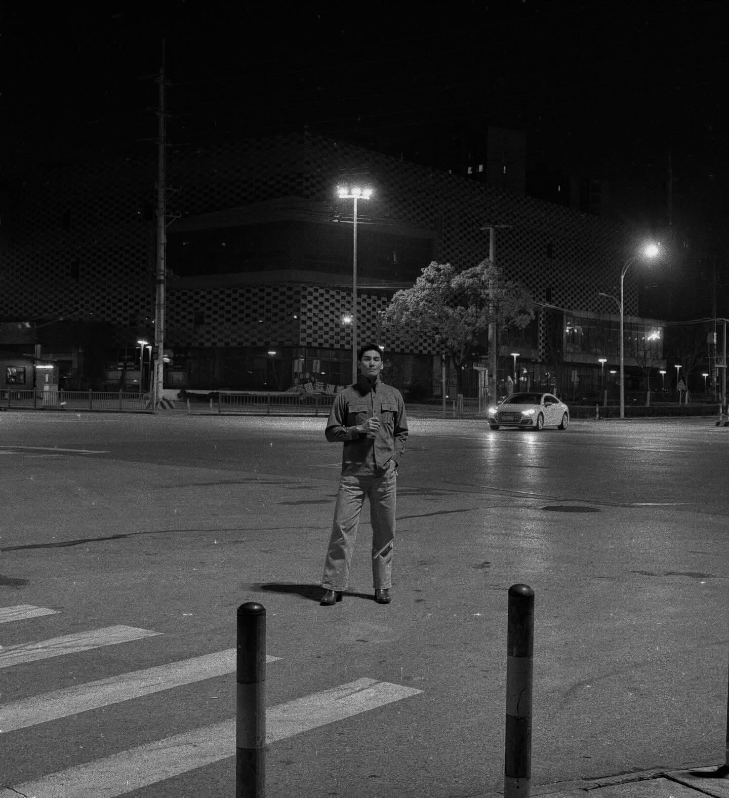 静まり返った都会の交差点を背景に、ワークジャケットとデニムをさらりと着こなした立ち姿は、計算されていない自然体の格好良さが際立っています。街灯の光と影が織りなすコントラストが、彼の端正な顔立ちをより鮮明に浮かび上がらせており、色がない世界だからこそ引き立つ、彼自身の圧倒的な存在感がファンを魅了しています。