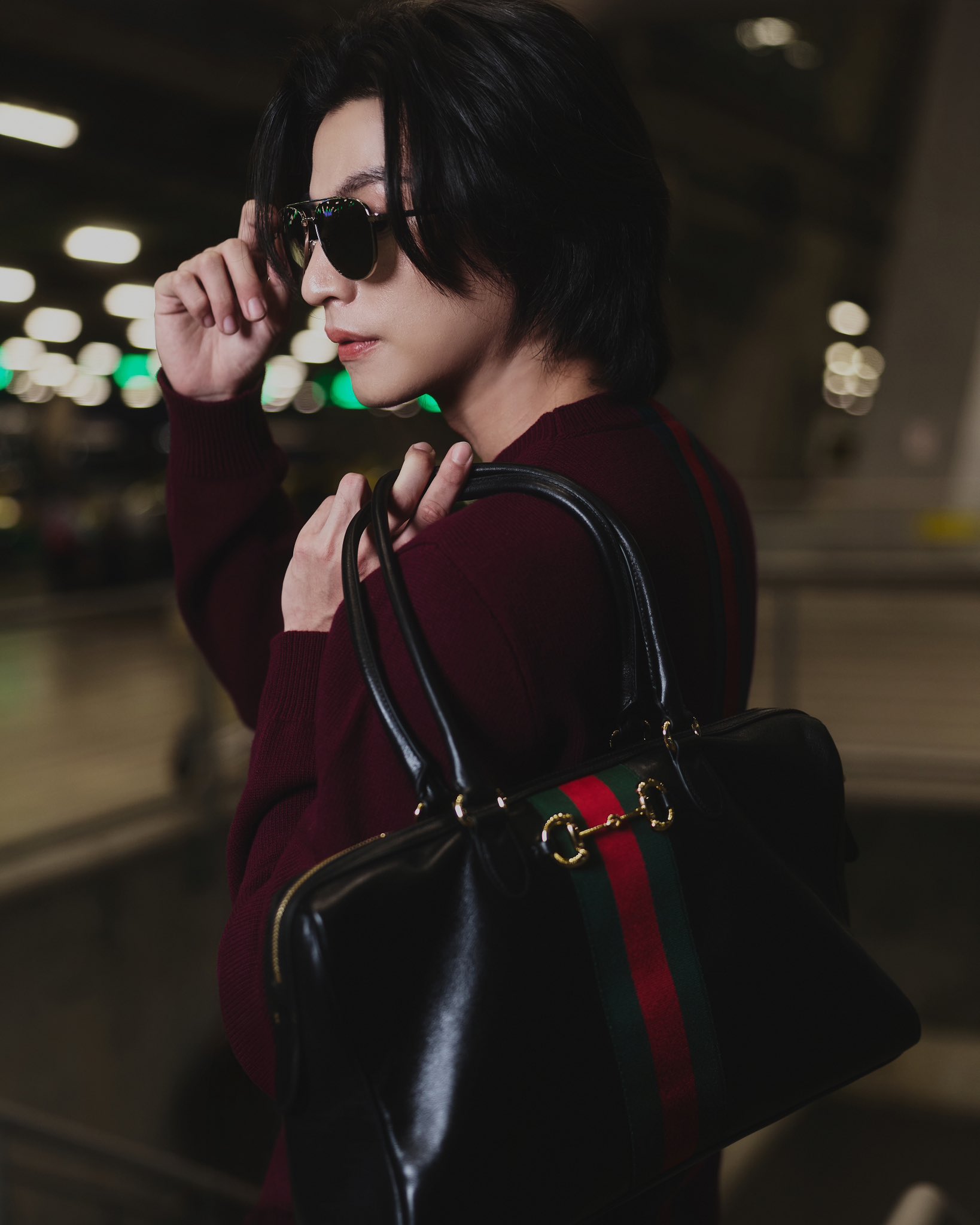 今回、ガルフが現地で披露したスタイルは、自身がブランドアンバサダーを務める「GUCCI(グッチ)」の最新コレクションです。深みのあるボルドーのジップアップニットに、ヴィンテージライクなデニムを合わせた着こなしは、シックでありながらミラノの街に溶け込むモダンな洗練さを感じさせます。手元には、グッチの伝統を象徴するウェブ ストライプとホースビットが輝くブラックレザーのボストンバッグを携え、長旅の疲れを感じさせない完璧なルックでファンの視線を釘付けにしました。