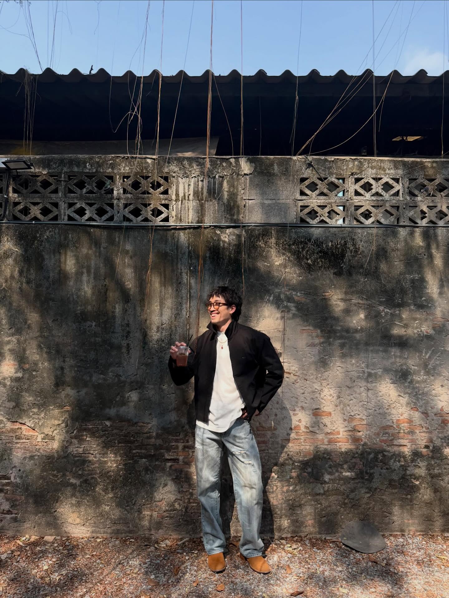 今回、彼がセレクトしたのは、タイの人気ブランド「CPS CHAPS」が展開する新ライン「cps.label」のアイテムです。「Messy curly hair day(ラフなカーリーヘアの日)」という言葉通り、ラフにセットされた無造作なカーリーヘアに、胸ポケットのゴールドロゴが目を引くホワイトTシャツとシックなブラックジャケットを羽織ったスタイルは、彼特有の男らしさと都会的な洗練さを同時に感じさせます。