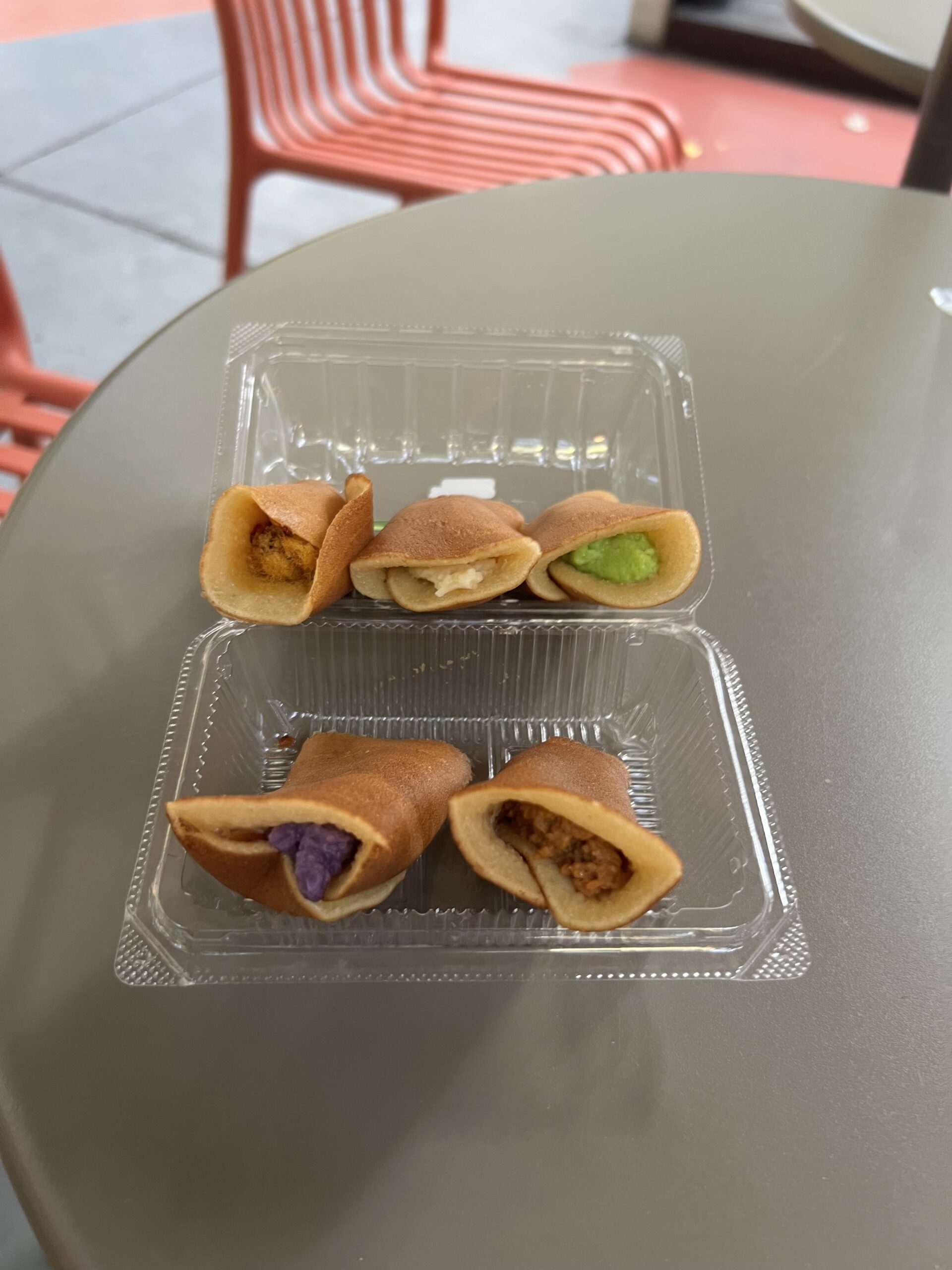 カノムトーキョウもクレープイープンと同様に、甘い系としょっぱい系があります。甘い系ではクリーム、カスタード、タロイモ、紫芋、タイティー味などが人気です。しょっぱい系ではチリペースト+豚肉フロスなどがあります。