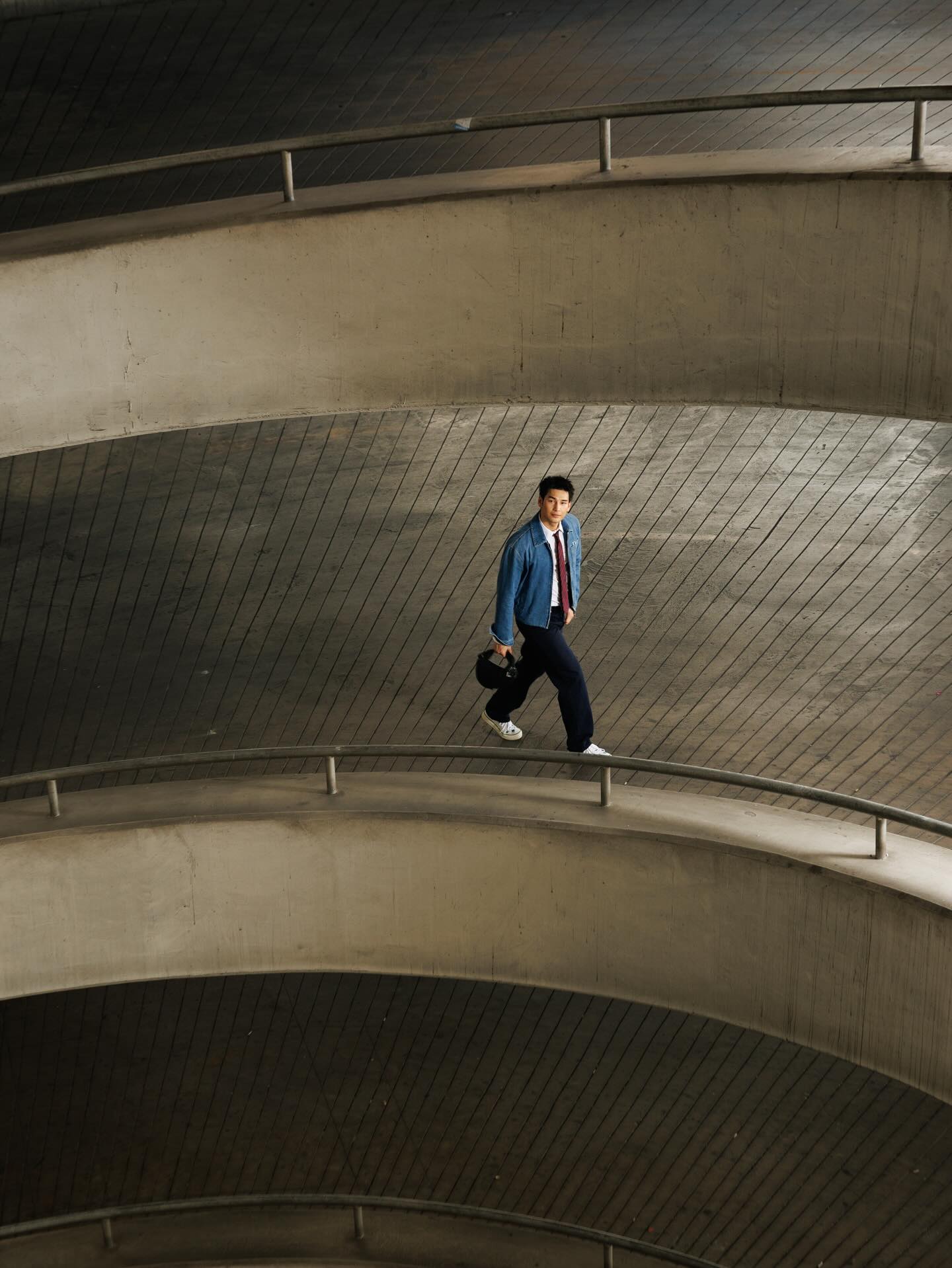 メインとなるコーディネートでは、胸元にアイコニックな「Dior」ロゴが配されたブルーのデニムジャケットを主役に、白シャツと赤×紺のレジメンタルタイを合わせたモダンなプレッピースタイルを提案。ワークウェアの無骨さとドレスアップの気品を絶妙にミックスさせる、彼らしいハイセンスな着こなしが光ります。