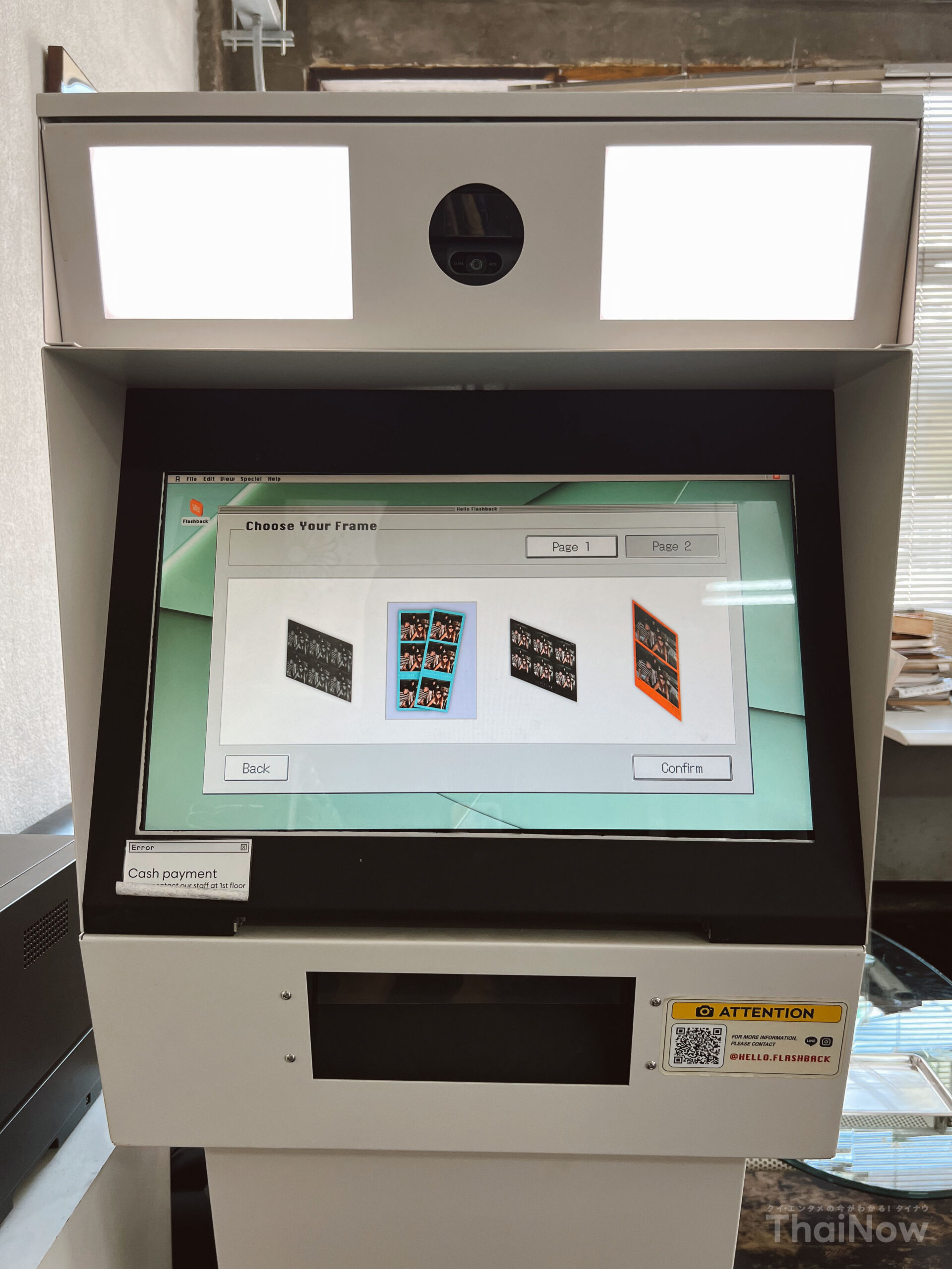 撮影時には通常レンズとフィッシュアイレンズのどちらかを選ぶことができ、フィッシュアイを選ぶと広い角度の写真が撮れます。写真はプリントが2枚もらえるだけでなく、QRコードからスマートフォンにデータをダウンロードすることもできます。料金は150バーツです。
