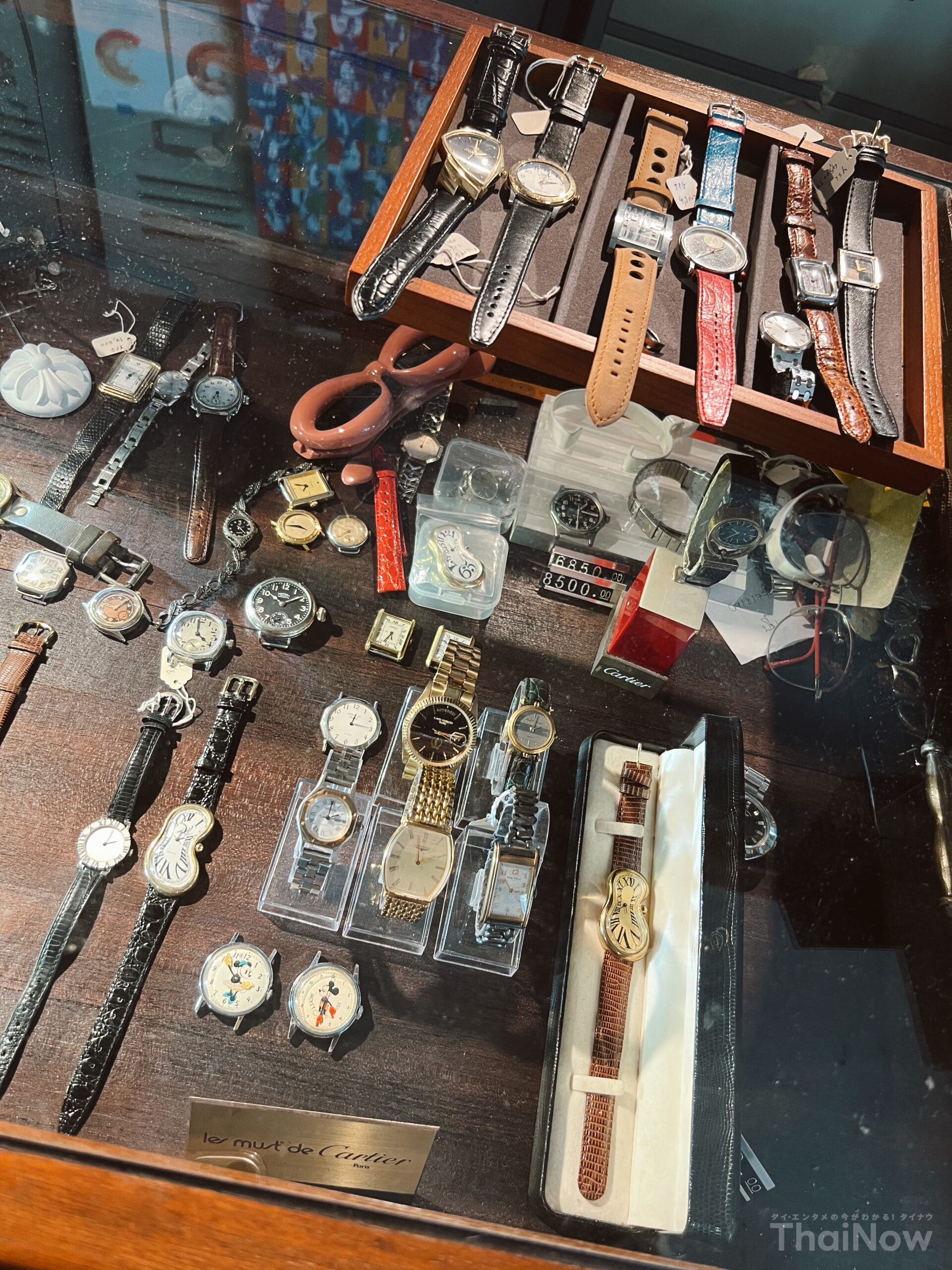 カウンターの奥には小さなスペースがあり、そこにはヴィンテージ時計のショーケースがあります。さらに階段の近くにはトイレがあり、入口から内装までしっかりテーマに合わせて装飾されています。