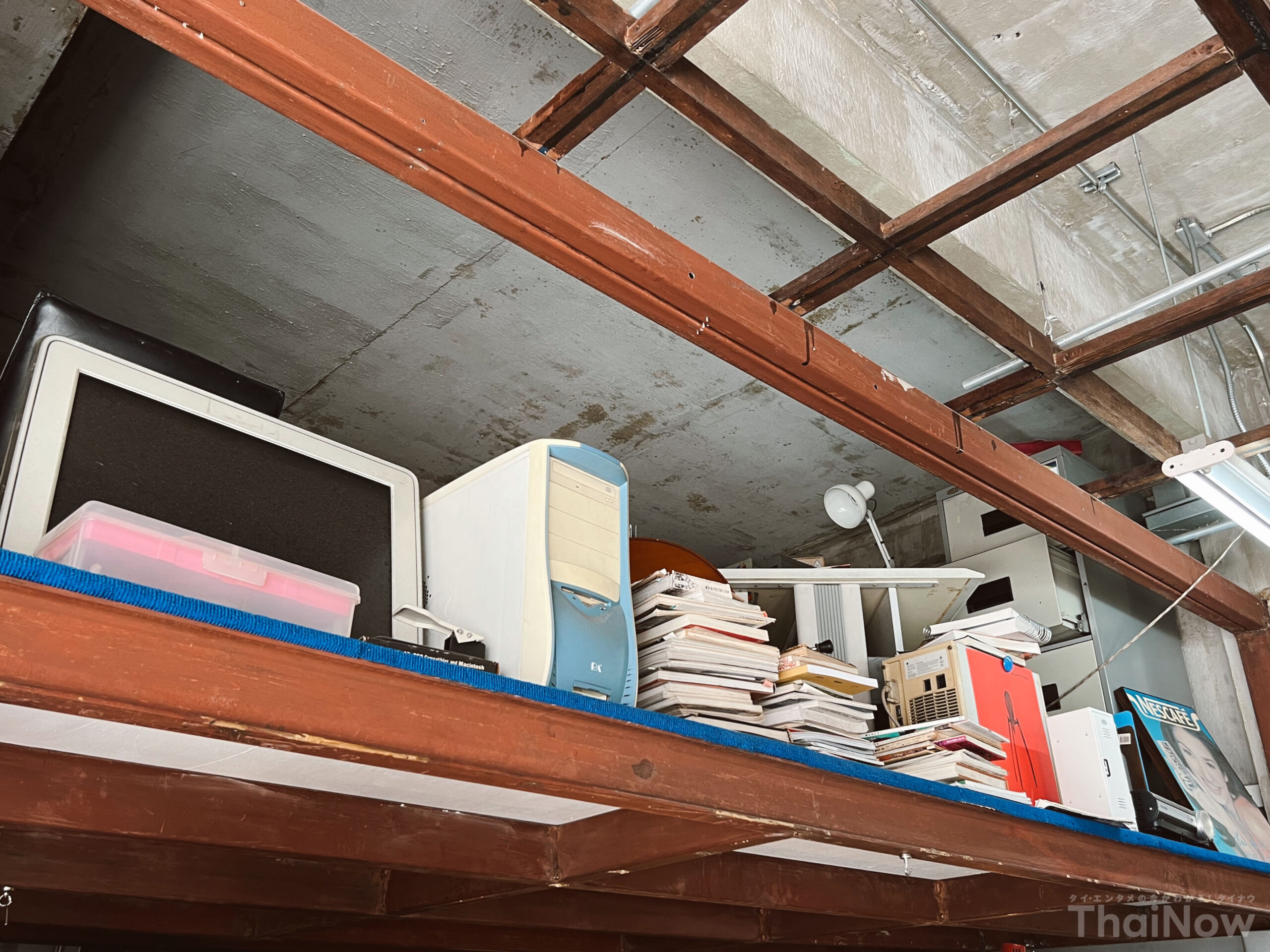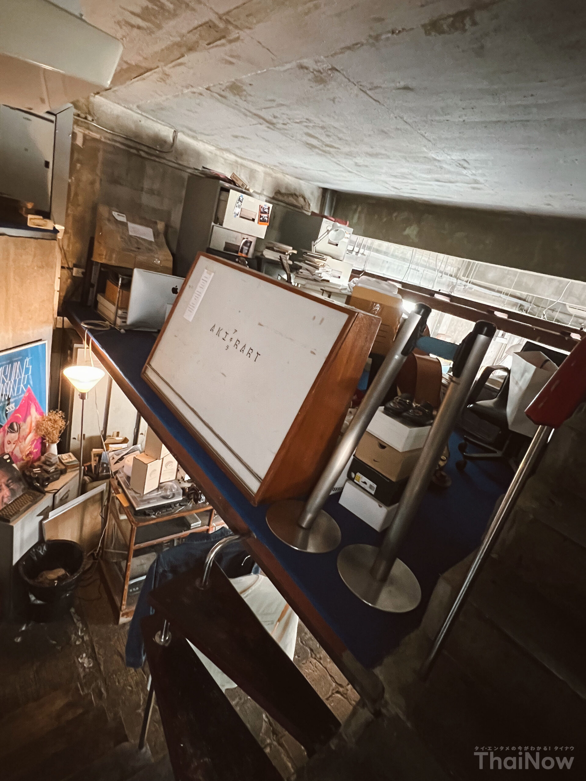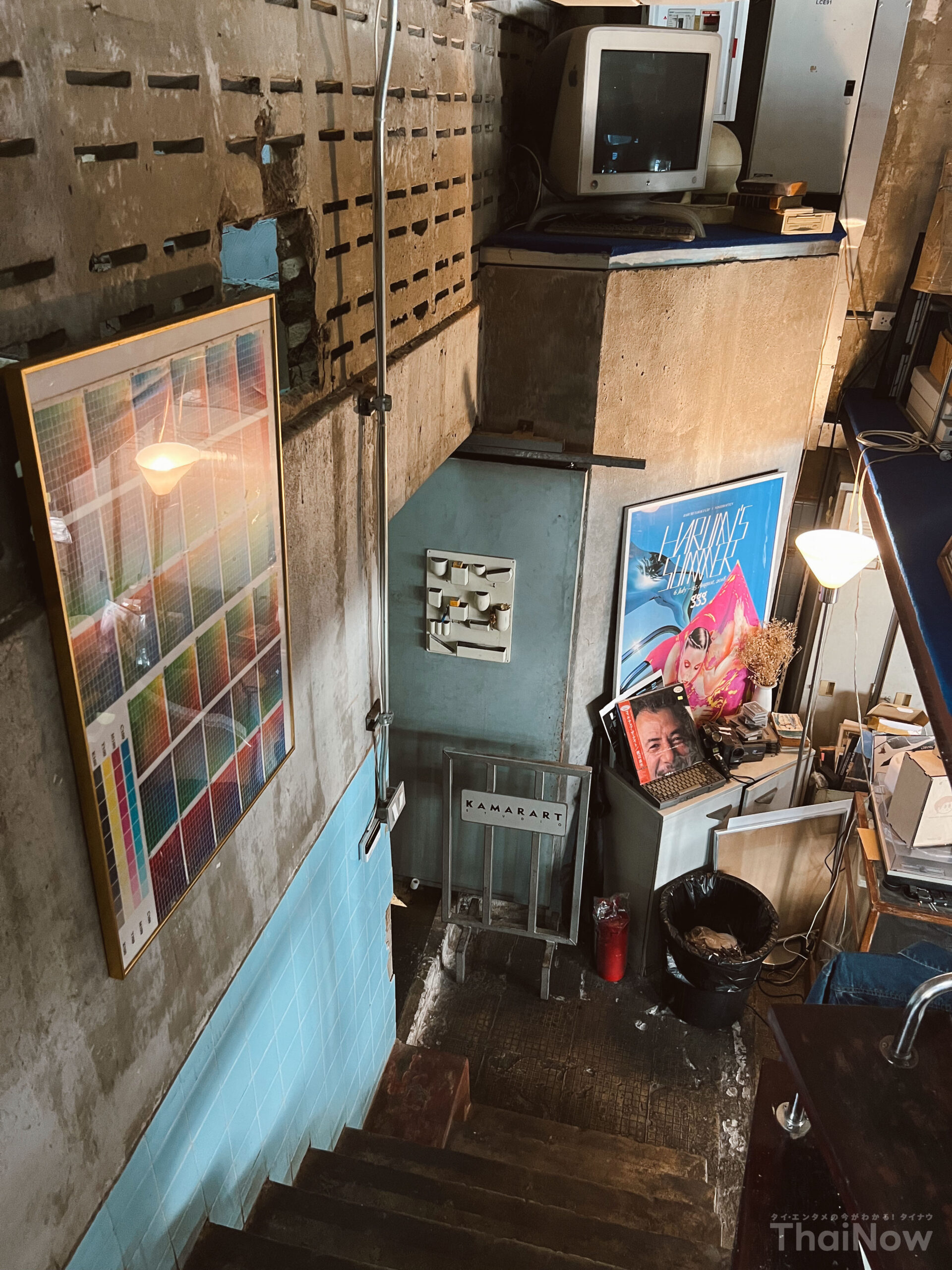 階段を上がる途中、ふと横を見ると小さなロフトのような収納スペースがあり、そこには古いコンピューターや書類の山が置かれています。この演出がまた絶妙で、80年代のオフィスのようなノスタルジックな雰囲気を強く感じさせます。