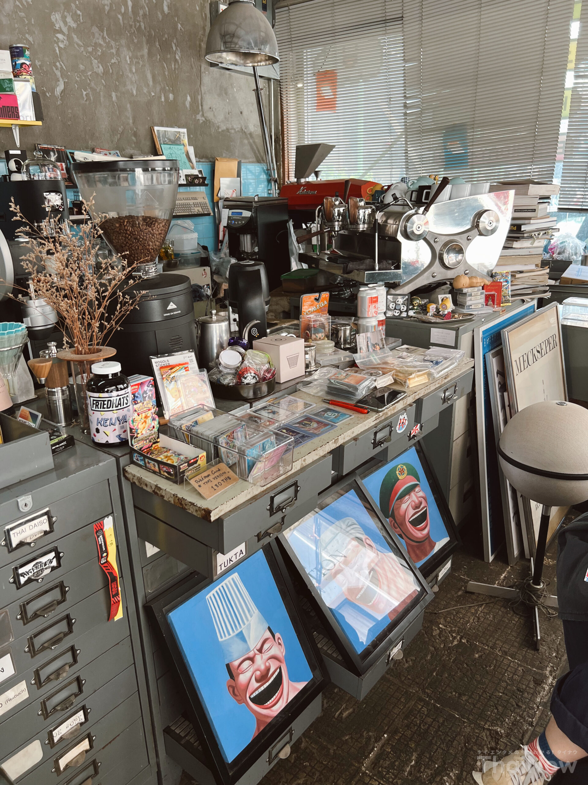店内は2階建てです。入口を入った瞬間、まるで1980年代にタイムスリップしたような空間が広がります。1階にはまずドリンクとフードを注文するカウンターがあります。このエリアにはおもちゃ、レコード、アルバムなど、レトロでおしゃれな雑貨が並んでいて、見ているだけでも楽しい空間になっています。