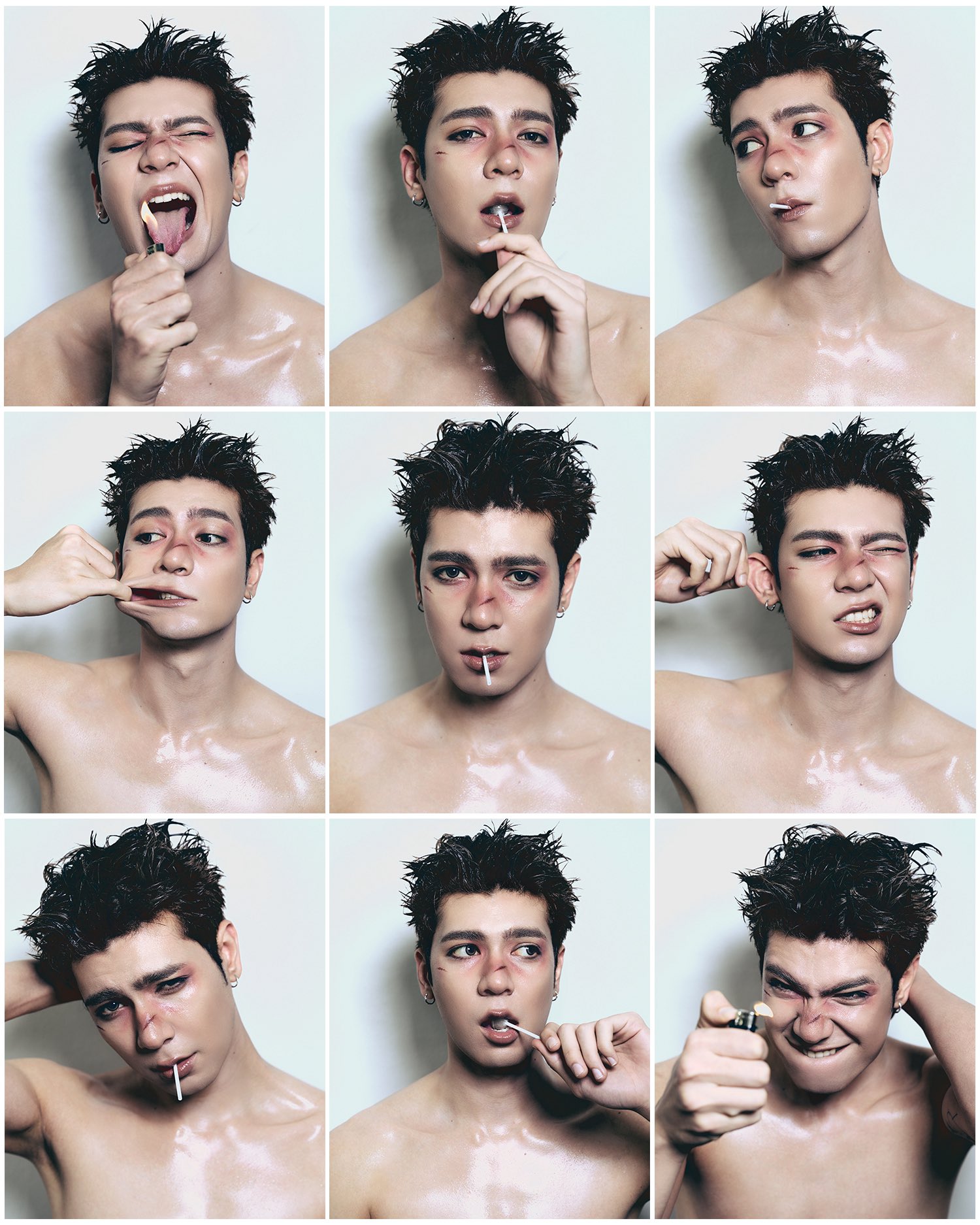 写真は白い背景の前で撮影されたポートレートで、Erwinは濡れたようなヘアスタイルとメイクで登場。ロリポップを口にくわえたり、表情を大きく崩したりするなど、さまざまな表情を見せている。シンプルな構図ながら、ポップ的で洋画のポスターのようなインパクトの強いビジュアルが印象的なシリーズとなっています。