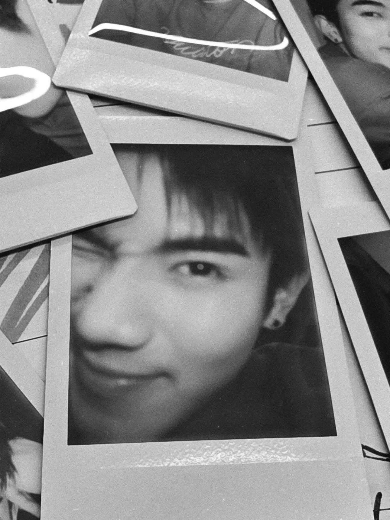 今回投稿されたのは、何枚ものポラロイド写真を無造作に散りばめた、ノスタルジックな雰囲気漂うモノクロショットです。カメラを優しく見つめる微笑みから、ふとした瞬間のアンニュイな横顔まで、彼の素顔をそのまま切り取ったかのような親密なビジュアルが並んでいます。