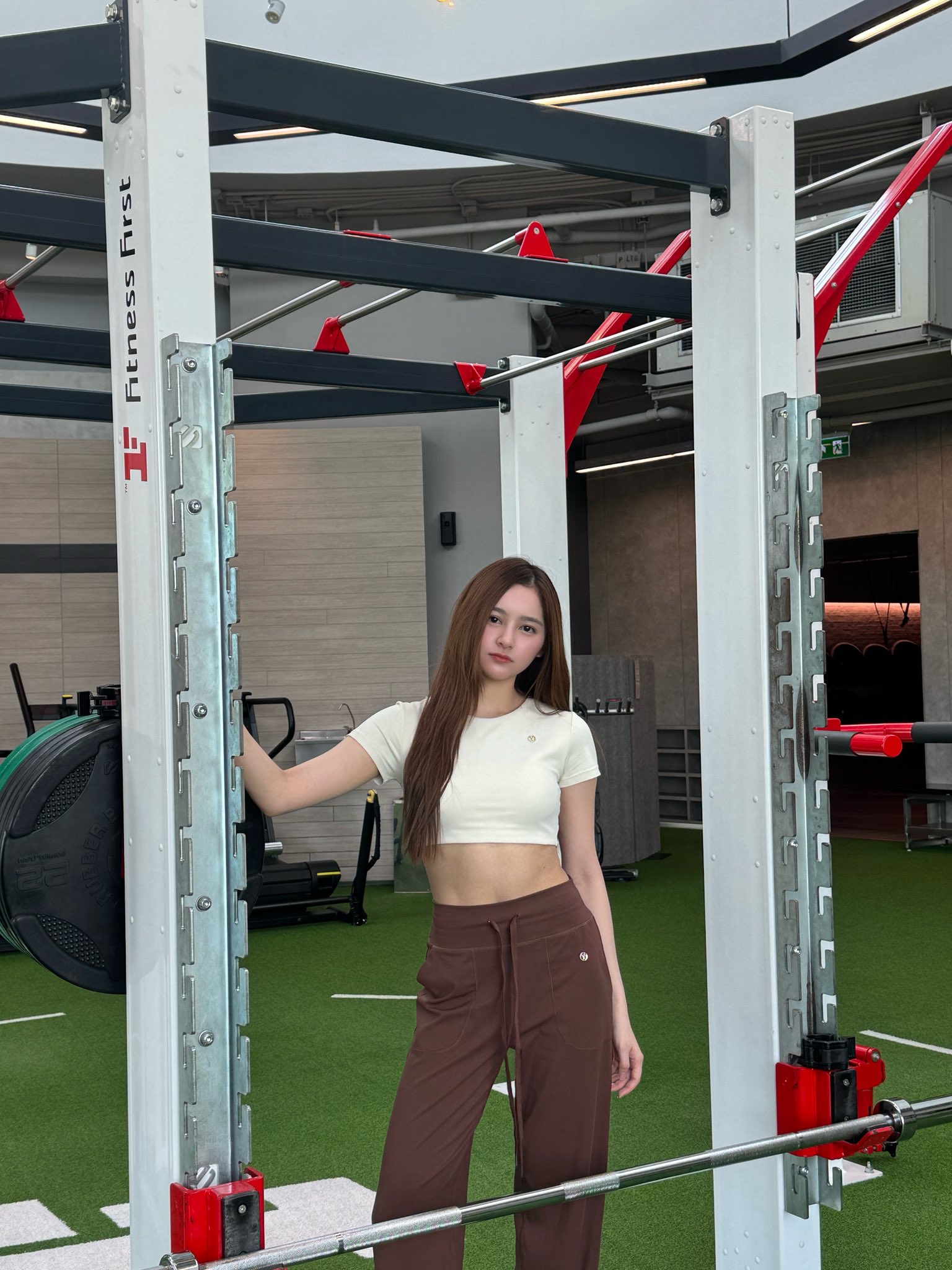 白のクロップドトップスにブラウンのパンツというシンプルなコーディネートながら、引き締まったウエストラインとスラリとしたスタイルが際立ち、健康的でナチュラルな魅力を放っています。ジムのトレーニングマシンの前でポーズを決めた写真では、まるでスポーツブランドのビジュアルのような雰囲気も感じさせます。