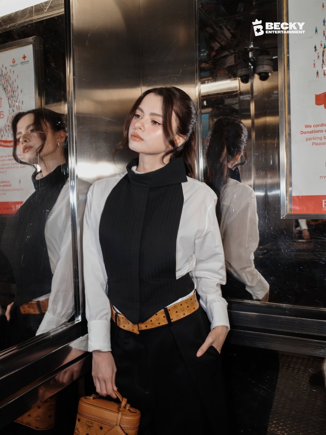 今回のイベントでベッキーが披露したのは、シャープなカットが印象的な黒のベストに、清潔感のある白シャツをレイヤードしたモードなモノトーンスタイルです。シックな装いのアクセントとして、腰元にはMCMのアイコニックなヴィセトス柄ベルトを、手元にはキャメルカラーのミニバッグを合わせ、ブランドの伝統と現代的なエッセンスを融合させたハイセンスな着こなしを見せました。